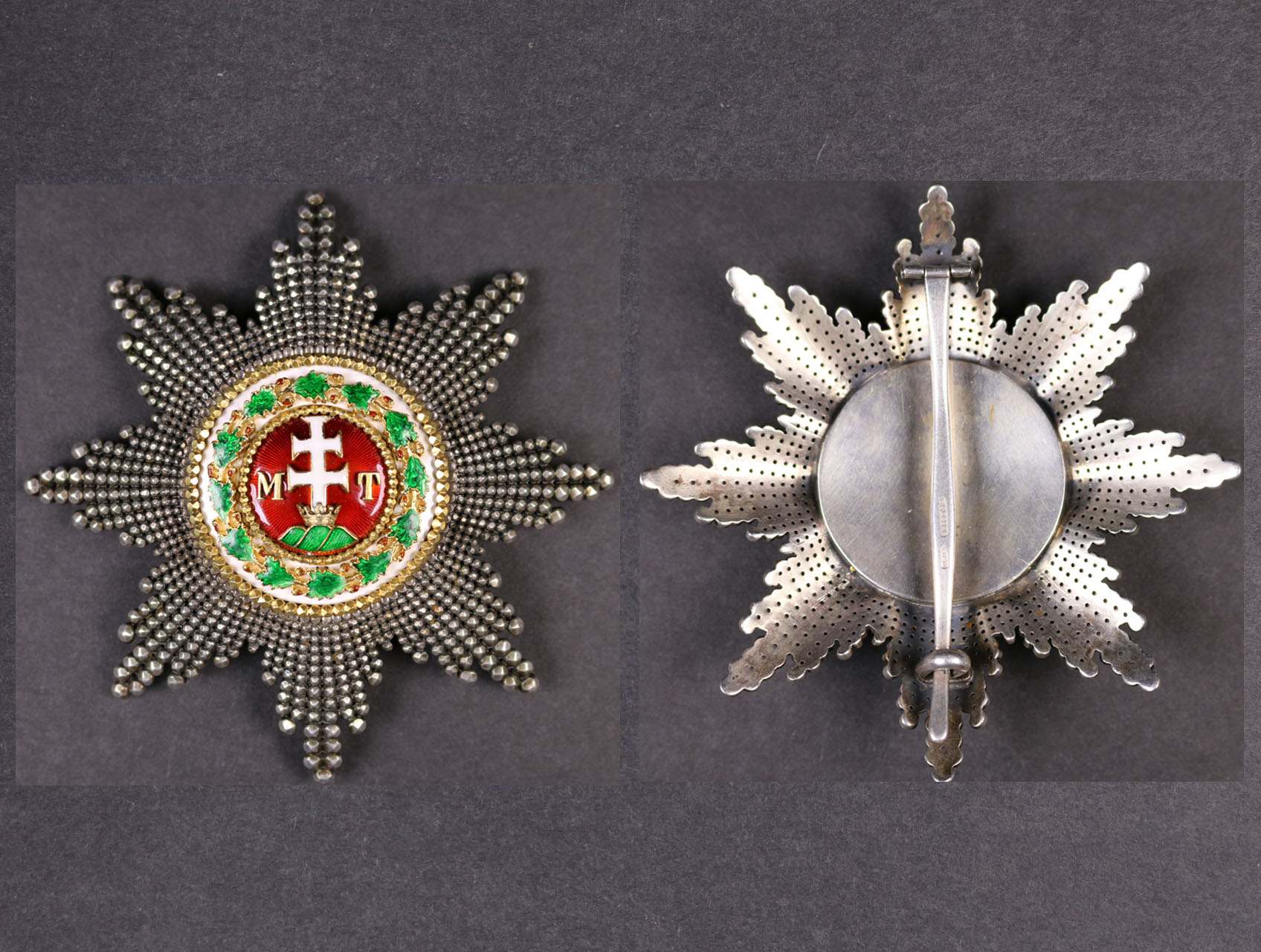 • Královský uherský řád Sv. Štěpána, hvězda řádu, sběratelská kopie, stříbro, smalty, značka výrobce C.F. Rothe na jehle.