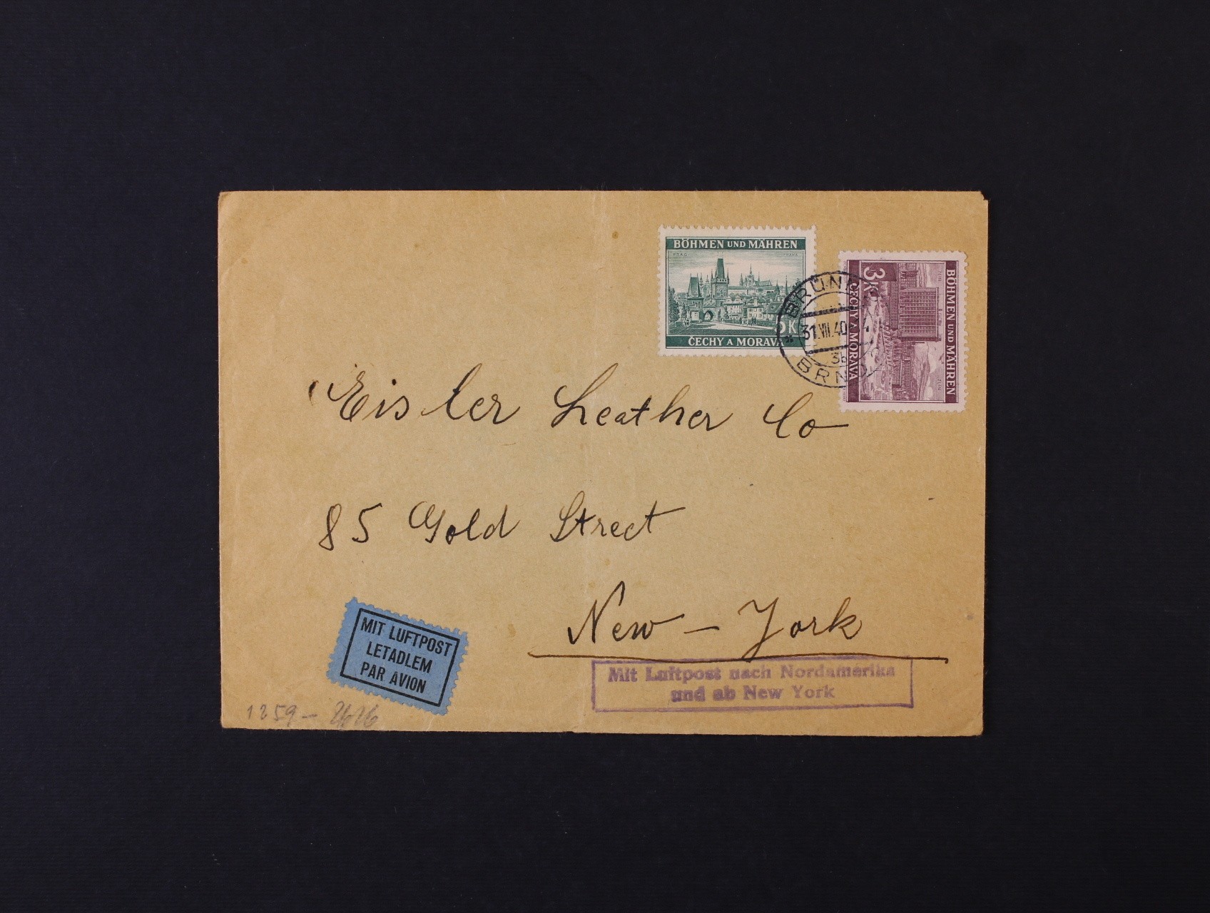 let. dopis do New Yorku frank. zn. č. 36, 38, pod. raz. BRNO 2 31.7.40 + přídavné rámeč. raz. Mit Luftpost nach Nordamerika und ab New York, na zadní str. cenzurní páska a raz., dopis uprostřed svisle přeložen