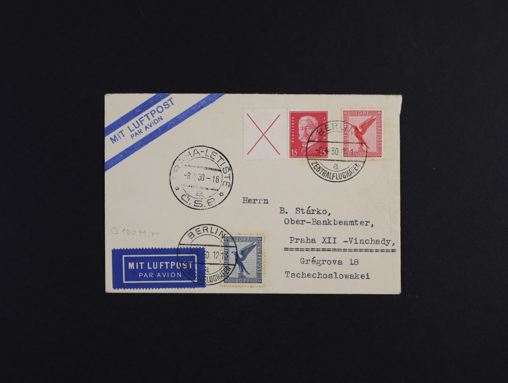 • let. dopis do Prahy frank. zn. Mi. č. 379, 380 + W 30, pod. raz. BERLIN ZENTRAL FLUGHAFEN 8.4.30 + přích. raz. PRAHA LETIŠTĚ 8.4.30