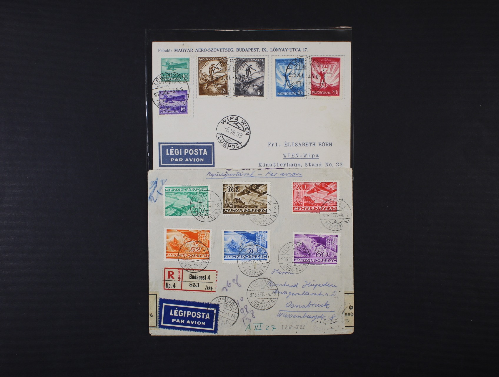 let. R-dopis do Osnabrücku frank. zn. Mi. č. 528 - 33, pod. raz. LÉGI POSTA BUDAPEST 4 4.SEP.1936, na zadní str. cenzurní páska a raz. OSNABRÜCK 5.9.36 a let. celistvost na výstavu WIPA WIEN 1933 frank. zn. Mi. č. 502 - 7, pod. raz. LÉGI POSTA BUDAPES 5.JUL.1933, přích. raz. WIPA WIEN FLUGPOST 5.7.33