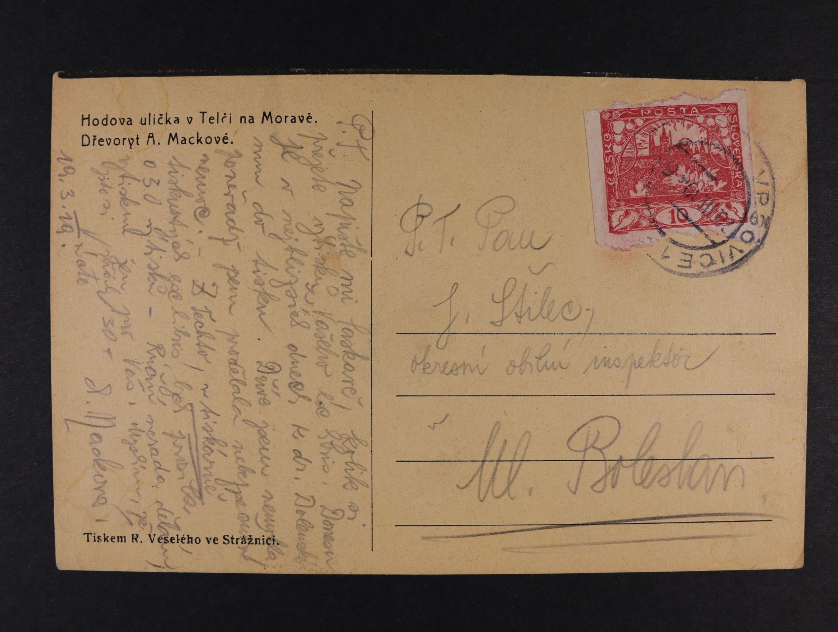 • Macková  A. malířka a grafička - pohlednice : dřevoryt A. Mackové s vlastnoručně psaným textem a podpisem