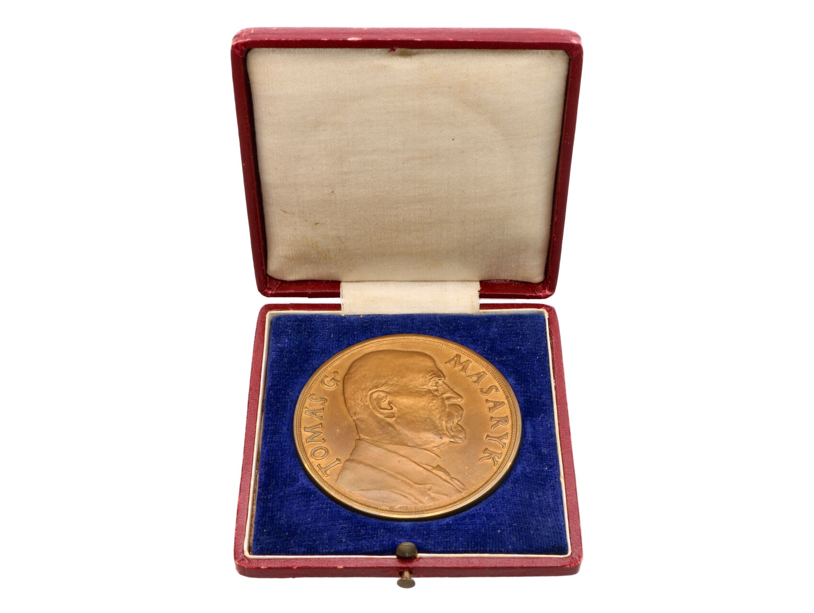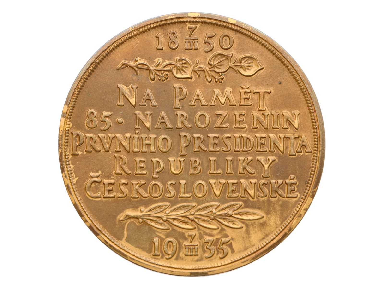 Masaryk Tomáš Garrigue 1850-1937 - AE medaile 1935, na paměť 85. narozenin prvního presidenta Republiky Československé, Portrét prezidenta zprava, opis / pětiřádkový nápis, nad a pod nápisem letopočty, lipová a vavřínová větvička. Bronz 60 mm, 68,68 g., signováno O. Španiel, původní etue, Novák 01.097f, Aurea M13f