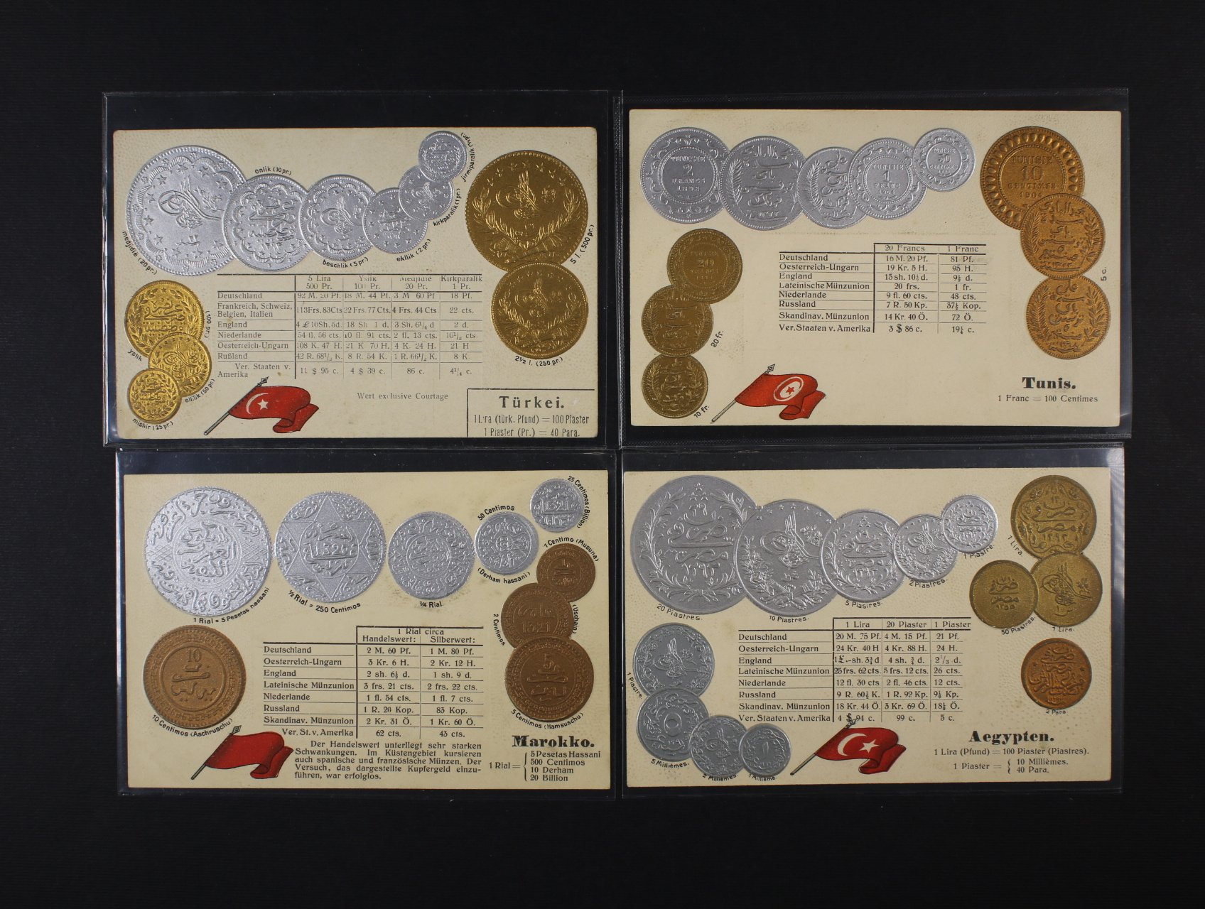 Mince - Egypt - Maroko - Tunis - Turecko - 4 bar. reliéfní litograf. koláže, dl. adresy, nepoužité