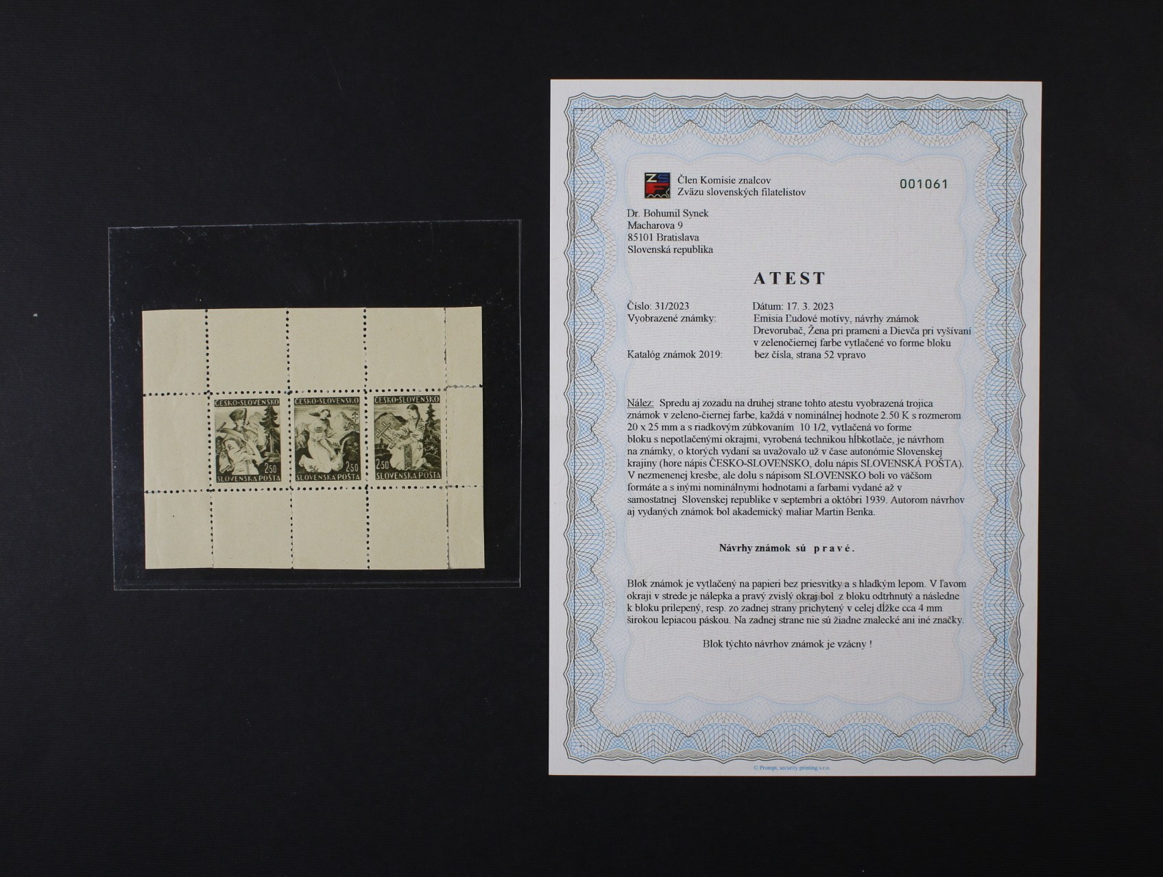 návrh nevydané zn. dřevorubec, žena při praní a děvče při vyšívání ve vodorovném soutisku v zelenočerné barvě v aršík. úpravě na papíře bez průsvitky a hladkým lepem, ŘZ 10 1/2, pravý okraj svisle podlepený, velmi vzácný ZT, atest Synek