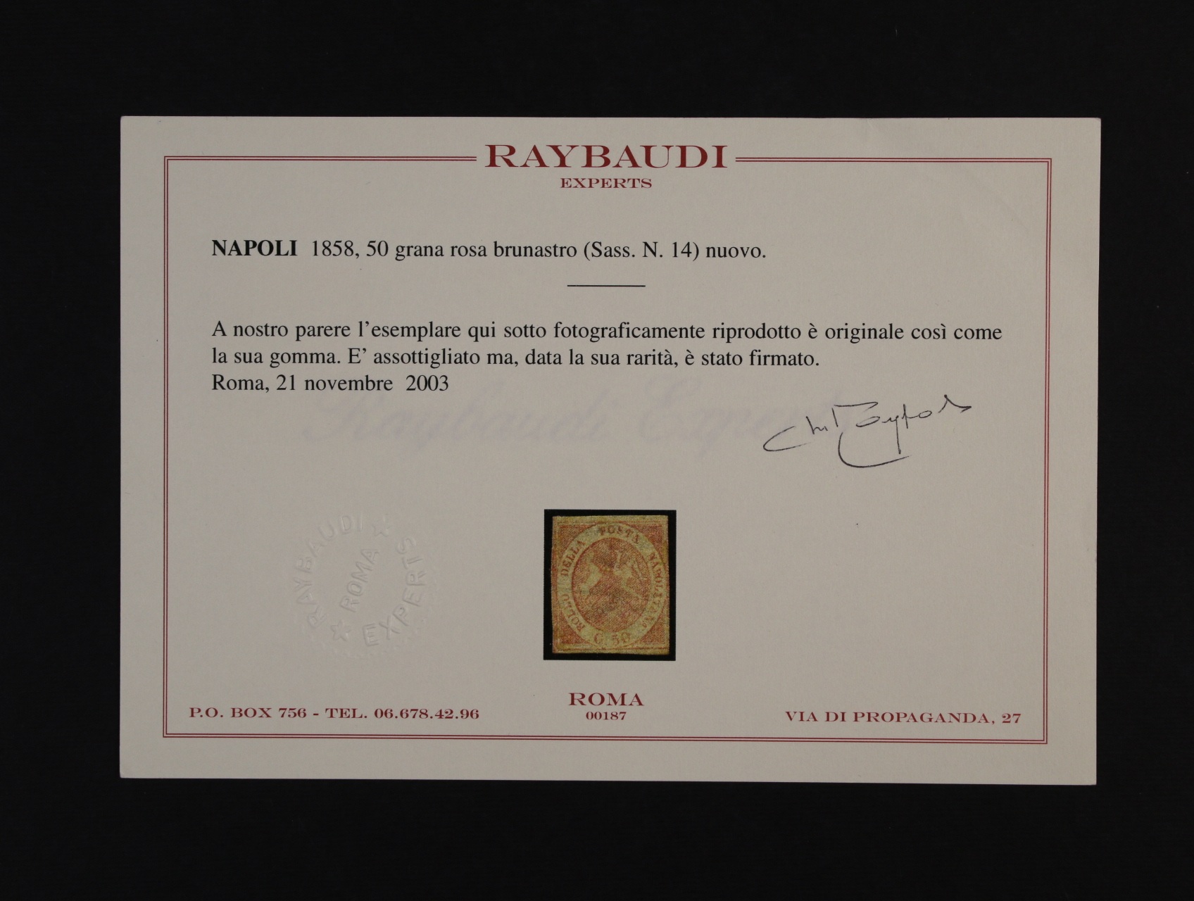 Neapol - zn. Sas. č. 14, zk. a atest Raybaudi, kat. Sas. 32000 EUR