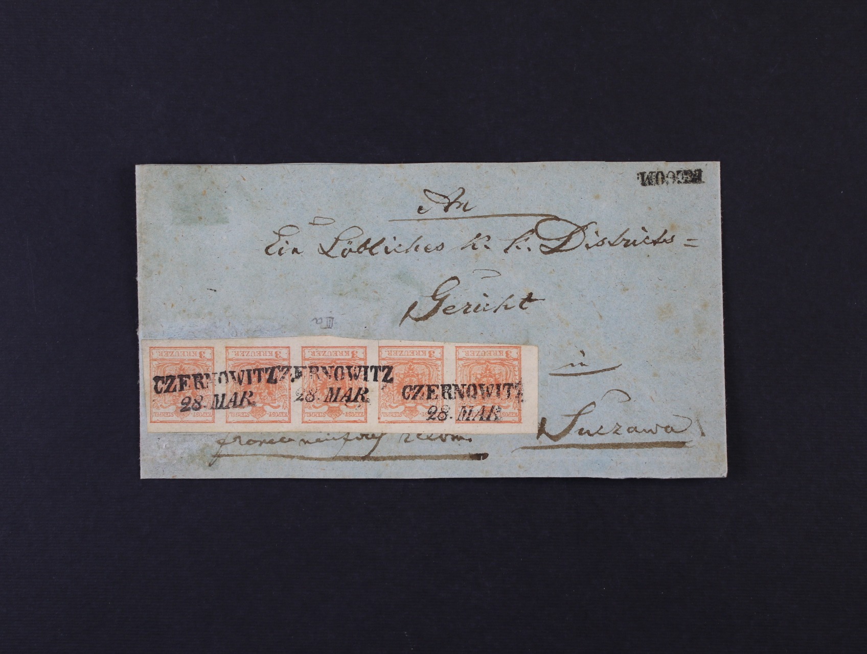 nekompl. R-obálka do SUCZAWA frank. zn. Fe. č. 3 HP typ III, ve vodorovné 5ti-pásce na přední straně a vodorovnou dvoupáskou na zadní straně (při otevírání odstřižena), pod. řádk. raz. CZERNOWITZ 28.MAR. + řádk. raz. RECOM, atest Ferchenbauer