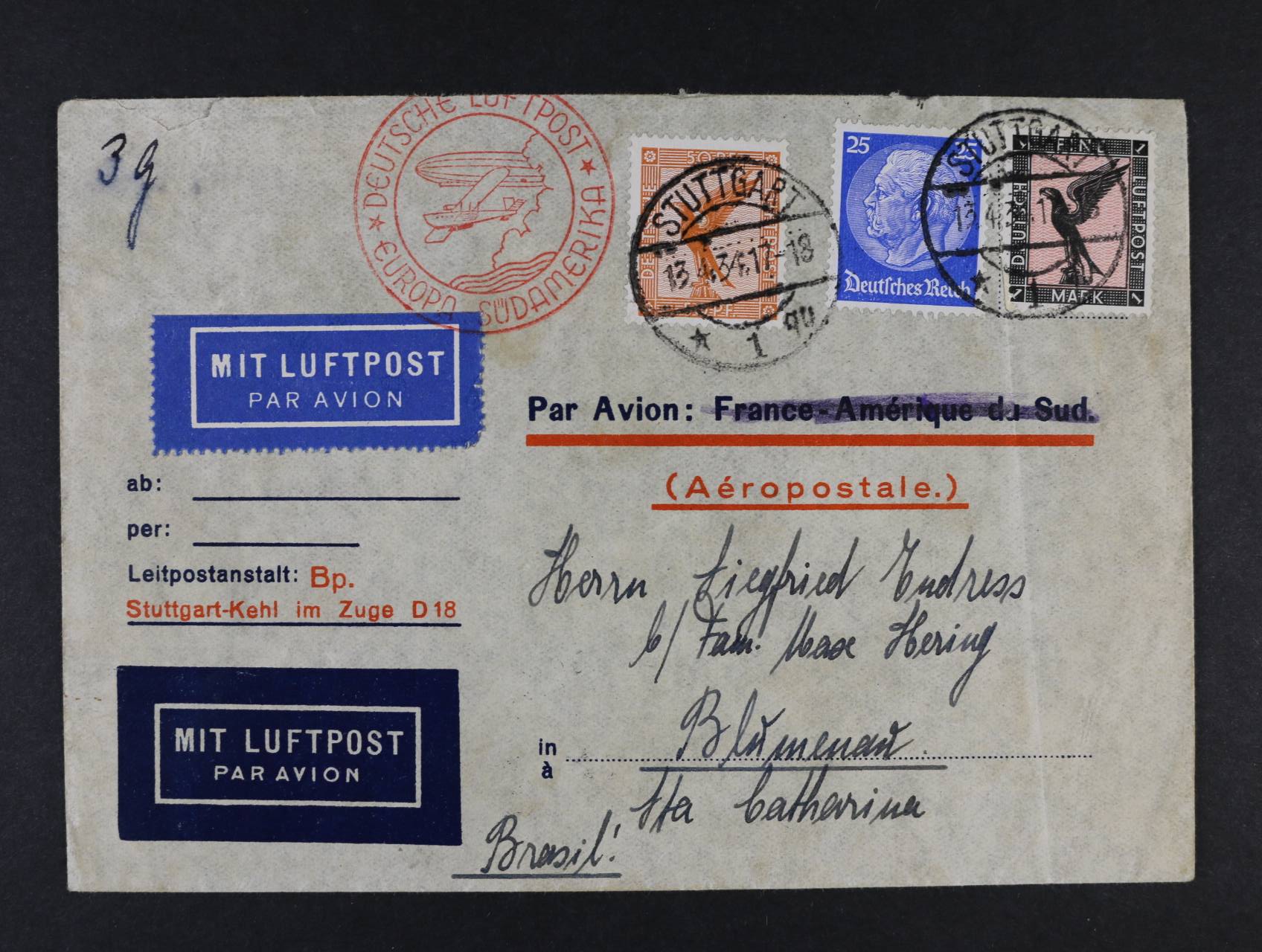 • Německo - předtištěná let. obálka do Brazílie frank. zn. Mi. č. 381 + 382 + 471, pod. raz. STUTTGART, červený let. kašt, průch. a přích. raz.