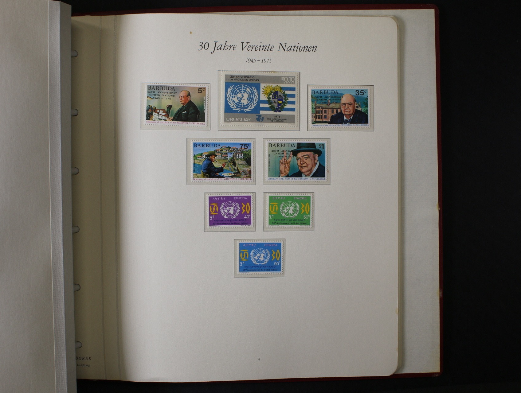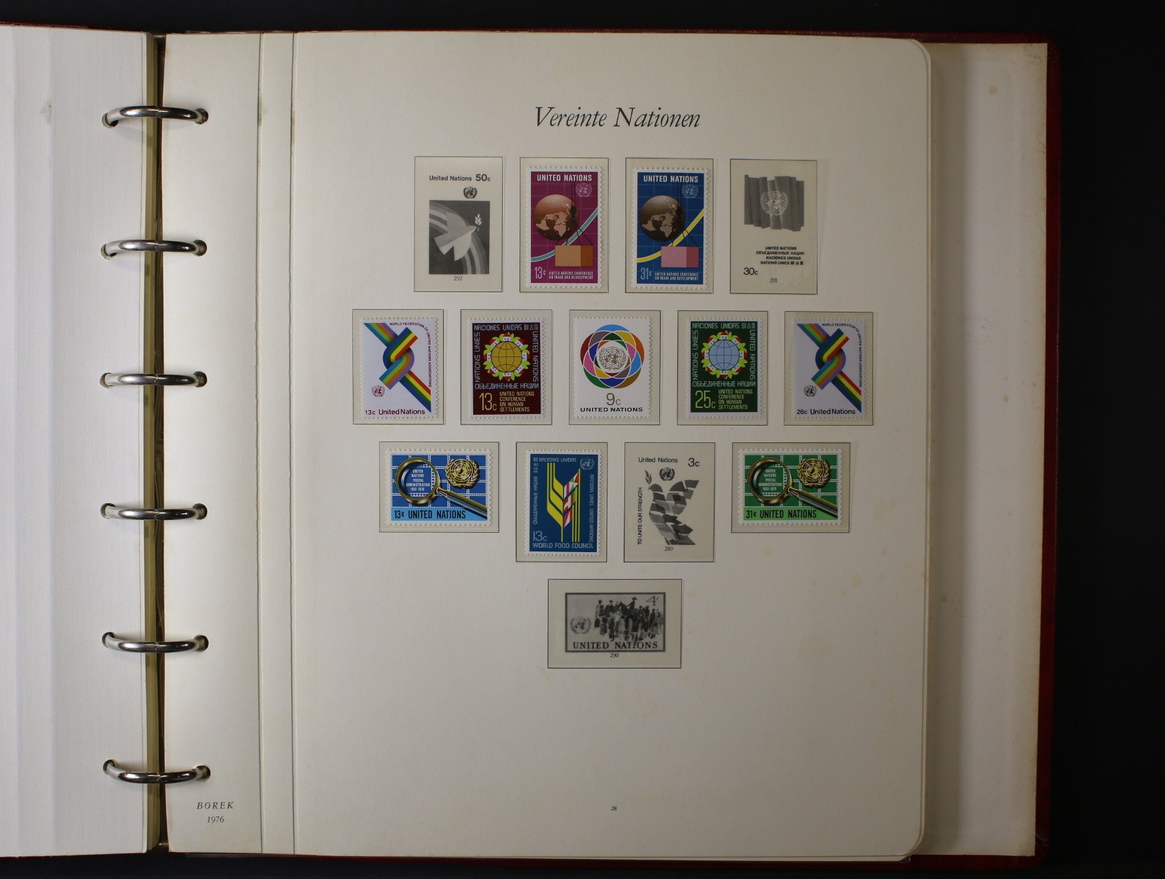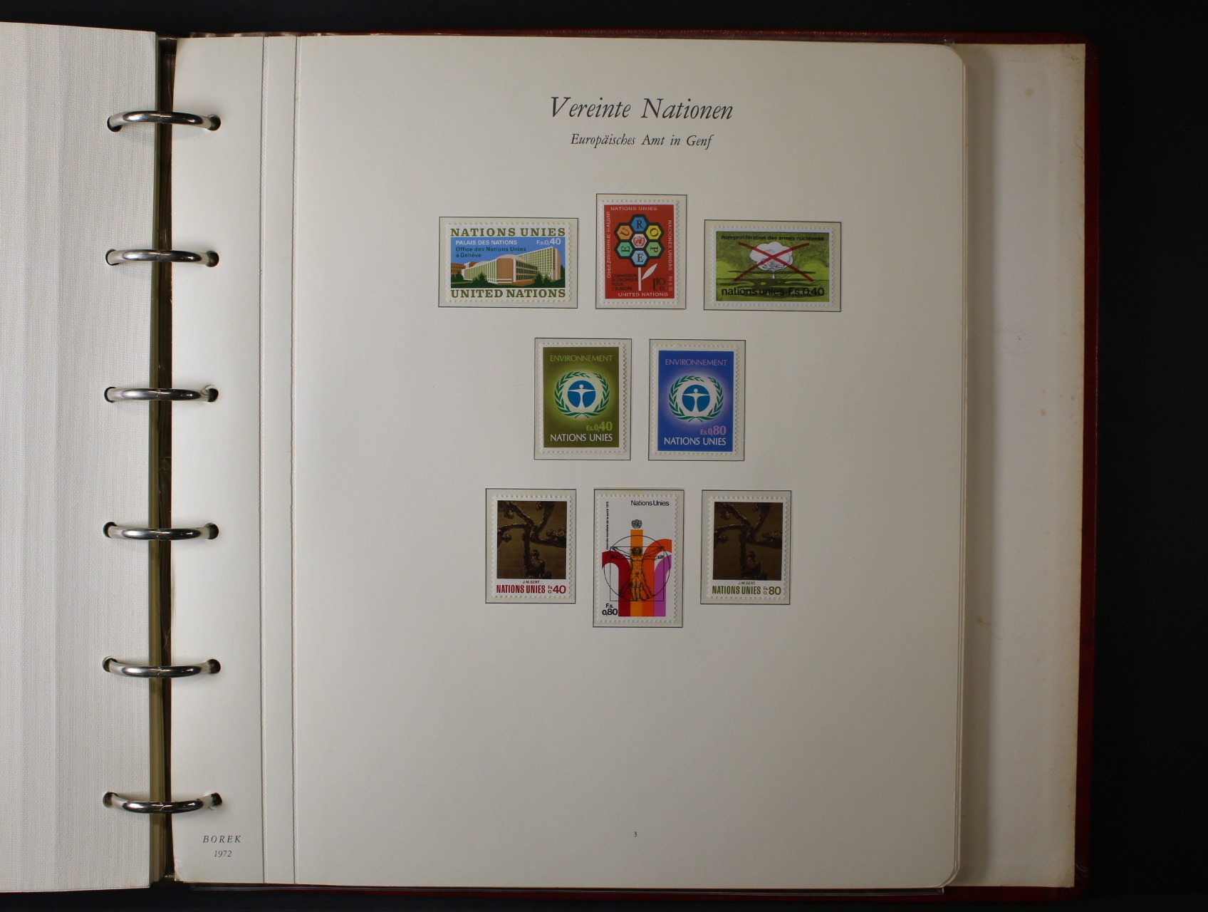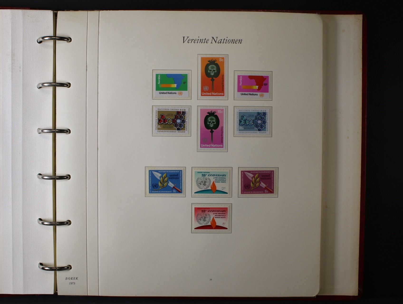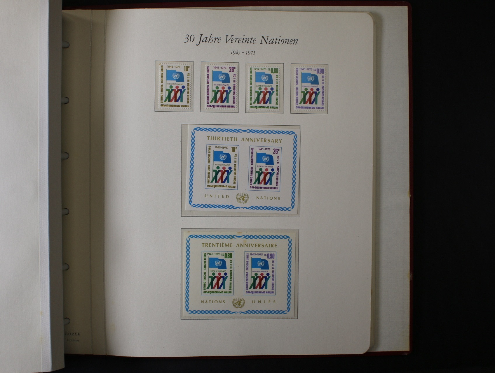 OSN - menší nekompl. sbírka zn., aršíků úřadovny New York, a Ženeva, navíc malá sbírka zn. vydaných k 30. výročí OSN 1945 - 1975 (z různých zemí) a malá sbírka zn. vydaných u příležitosti Mezinárodního roku dětí 1979, vše uloženo na zasklených listech Borek ve trojích červených luxusních mechanických deskách, kat. cena zn. cca 300 EUR