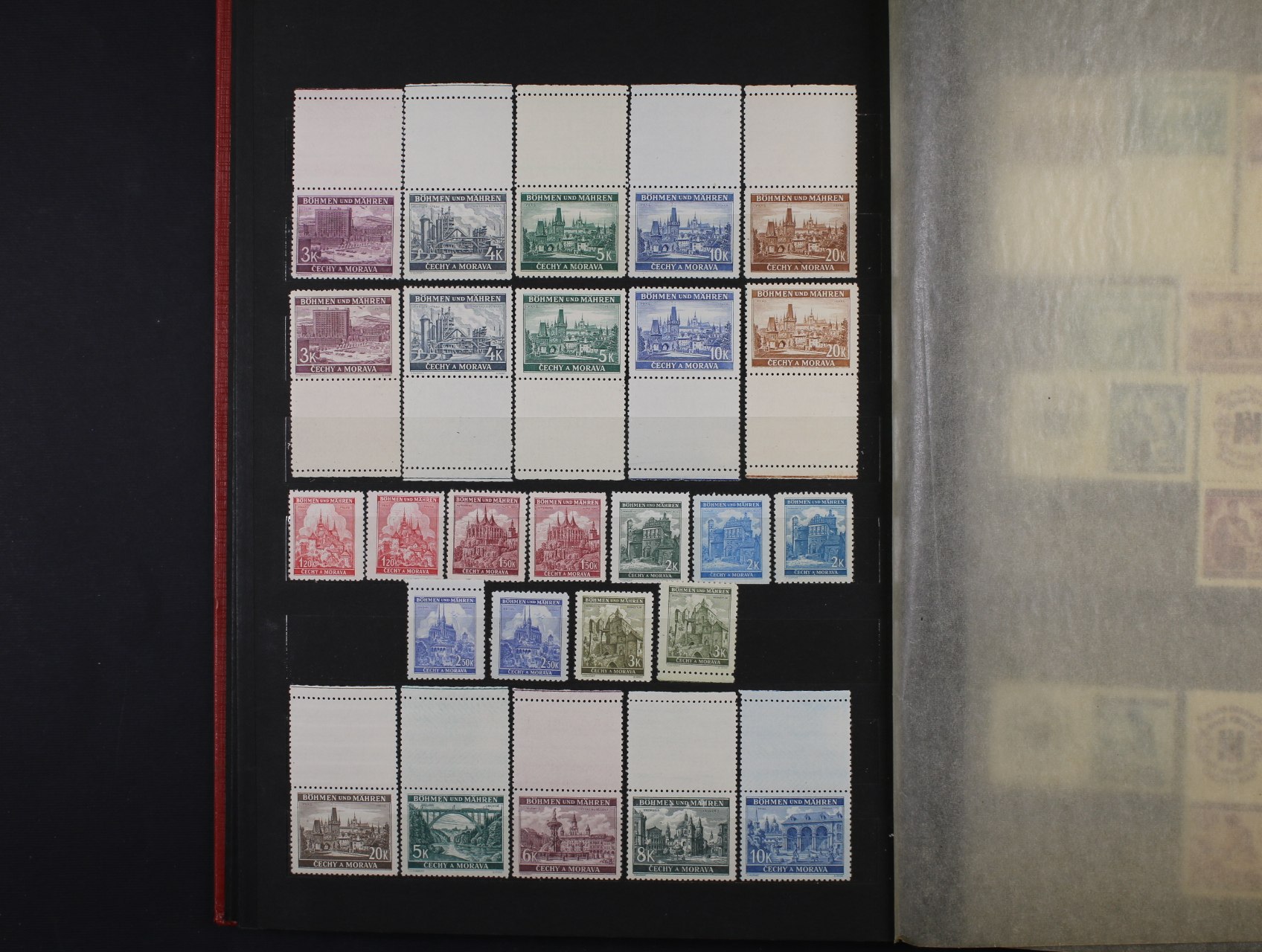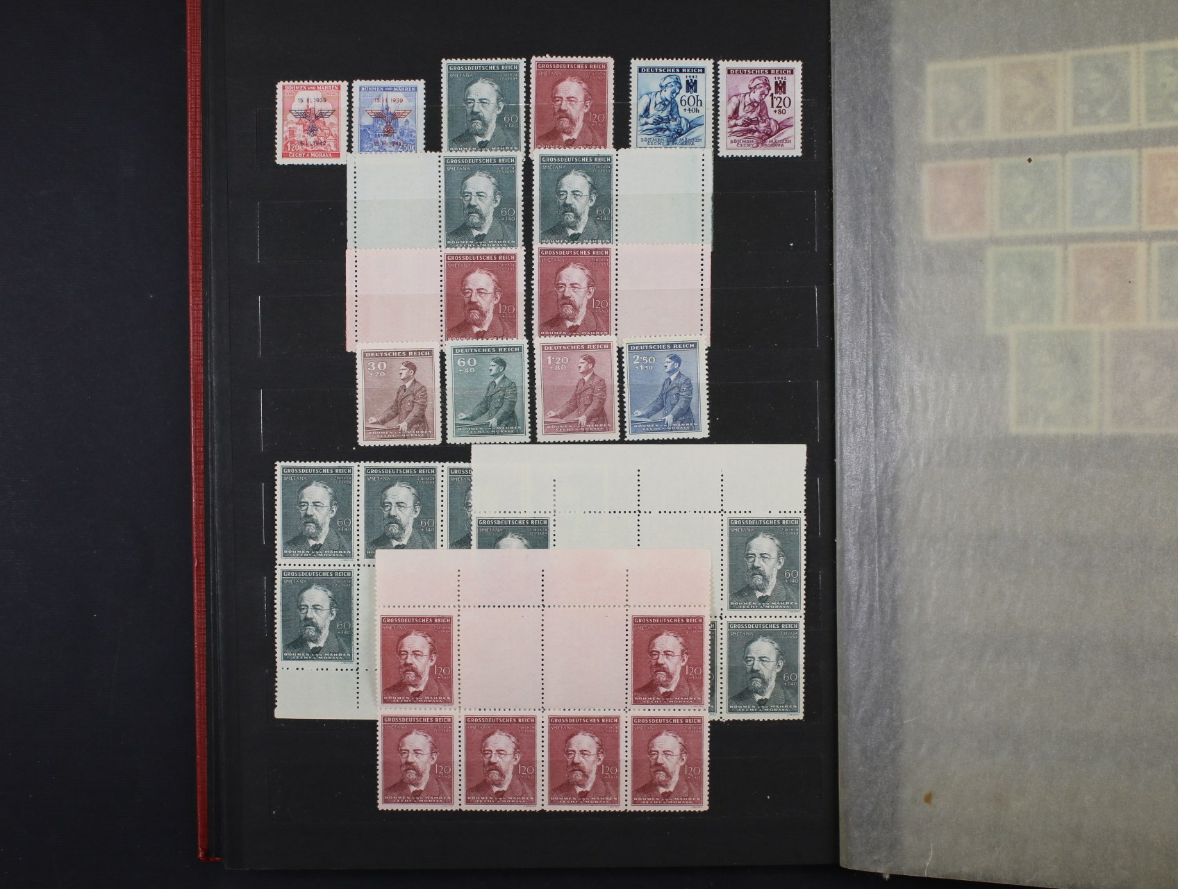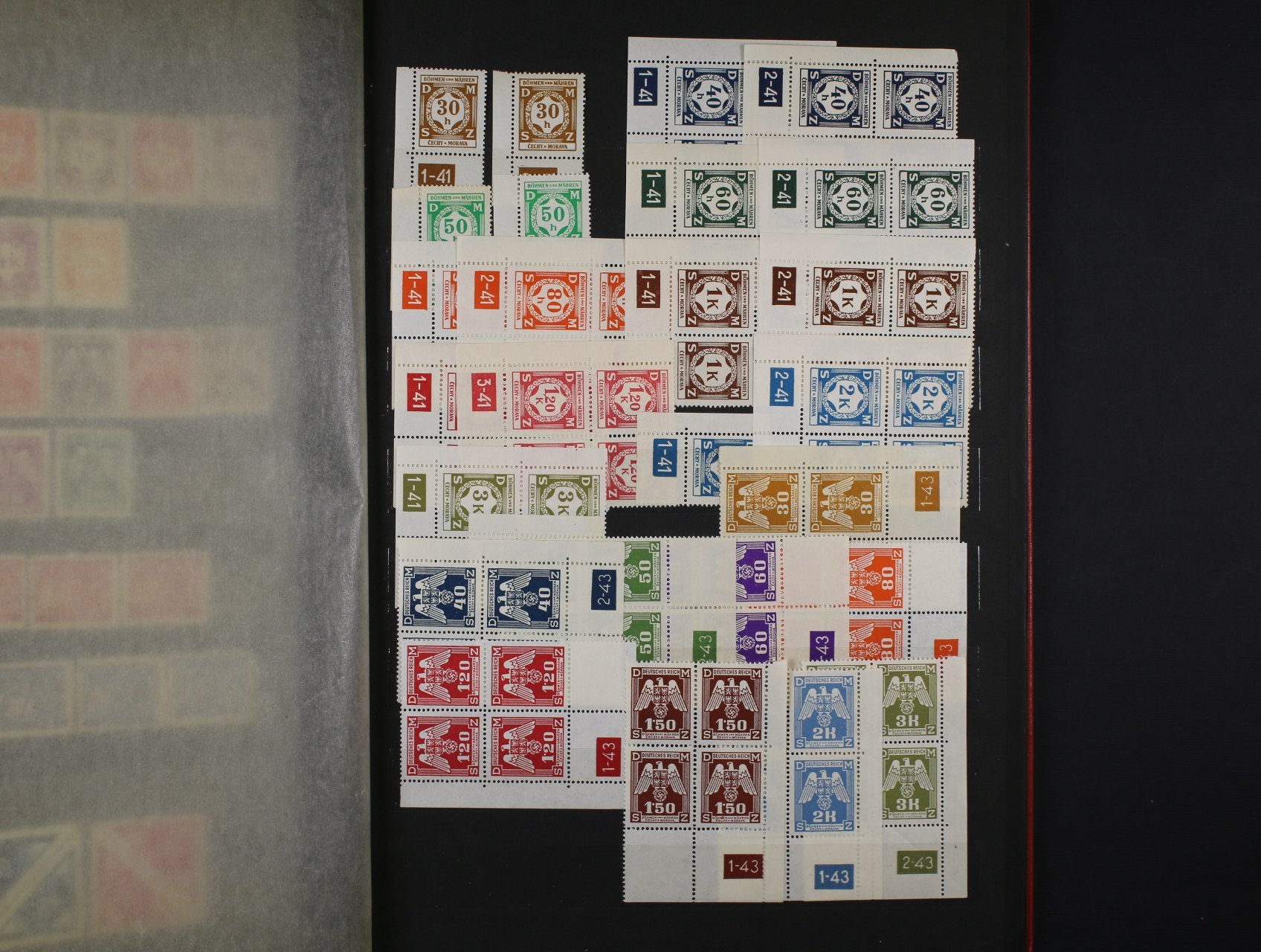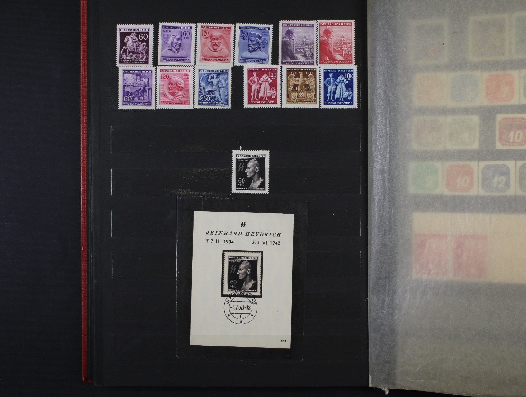 Protektorát - mírně rozšířená gen. sbírka o některé kupony, meziarší a DZ, vč. zn. č. 1 - 19 + pošta v ghetu Terezín (číslovaná příloha Monografie) + pam. list (papír s průsvitkou) se zn. č. 11 Reinhard Heydrich a DR BRÜNN 4.6.43 + stříhaný a zoubkovaný novotisk zn. Pr 1, zajímavé, k prohlédnutí, uloženo v červeném zásobníku A4
