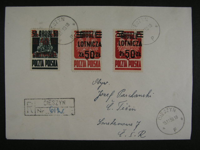 R-dopis do C. Tesina frank. zn. Mi. c. 584 + 585a, 585b, pod. raz. CIESZIN 15.1.50