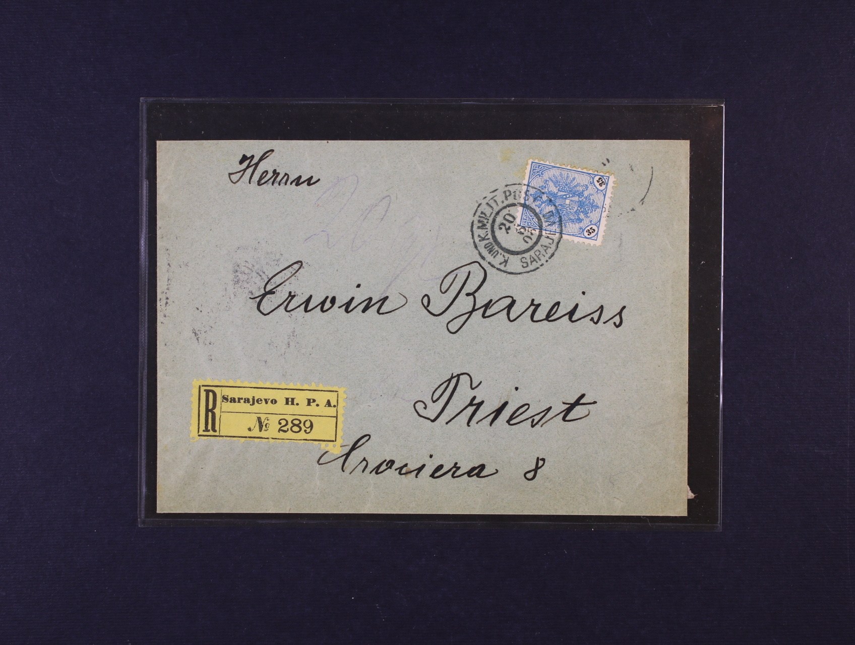 • R-dopis do Terstu frank. zn. Mi. č. 26, pod. raz. K.u.K. MILITERPOST SARAJEVO 20.6.1906