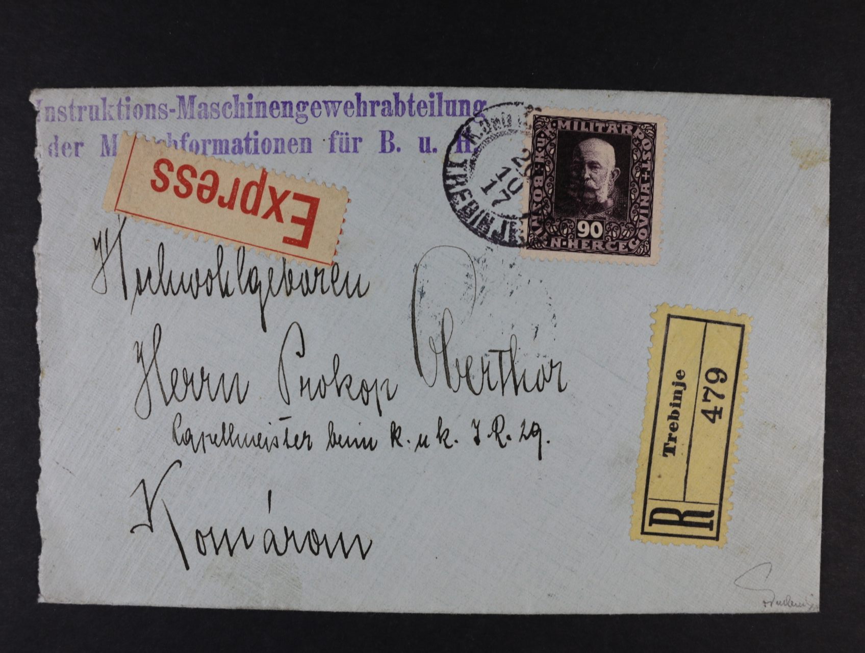 • R-EXPRES dopis frank. smíš. frankaturou emisí 1916 + 1917, na přední str. zn. Fe. č. 112 + 127, pod. raz. TREBINJE 20.10.17, příd. raz. FP + útvarové a přích. raz., zk. Ferchenbauer