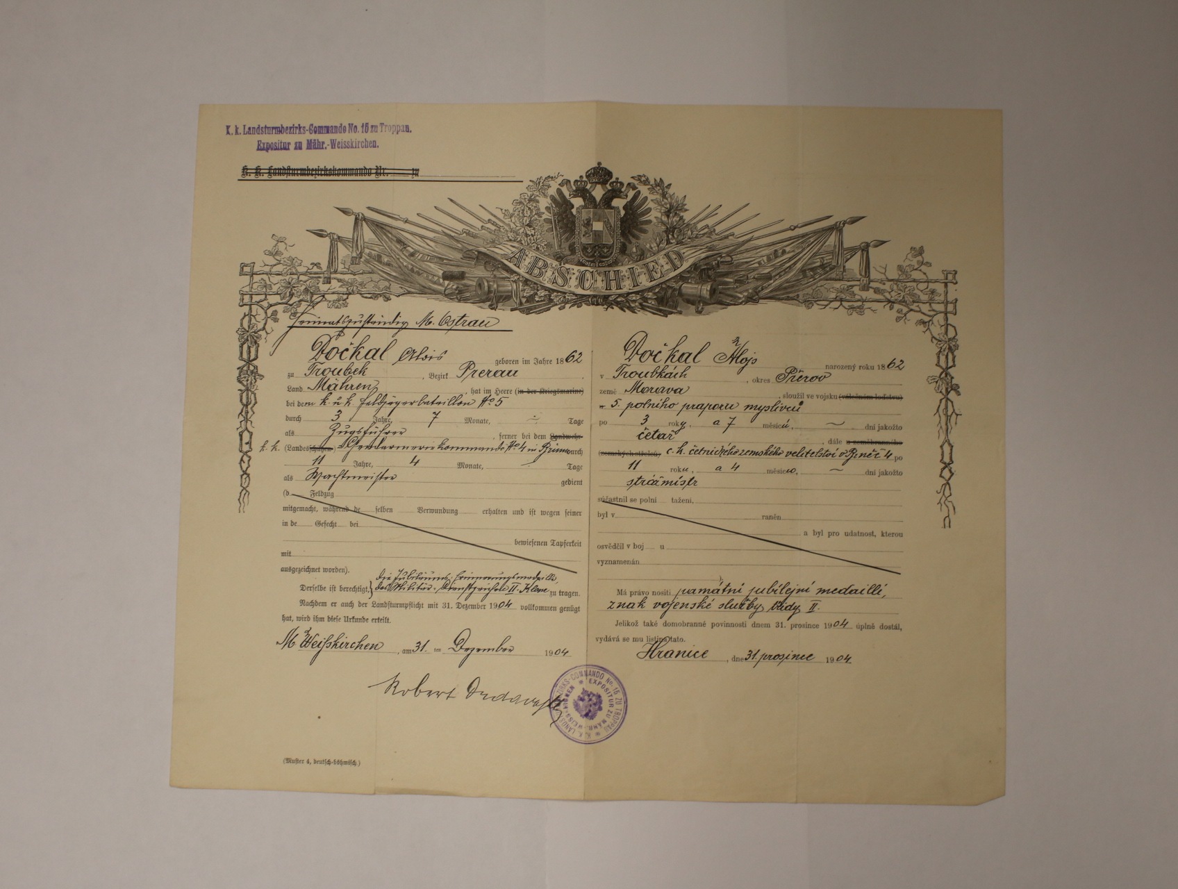 • Rakousko-uhersko - Propouštěcí list z vojenské, četnické služby z roku 1904
