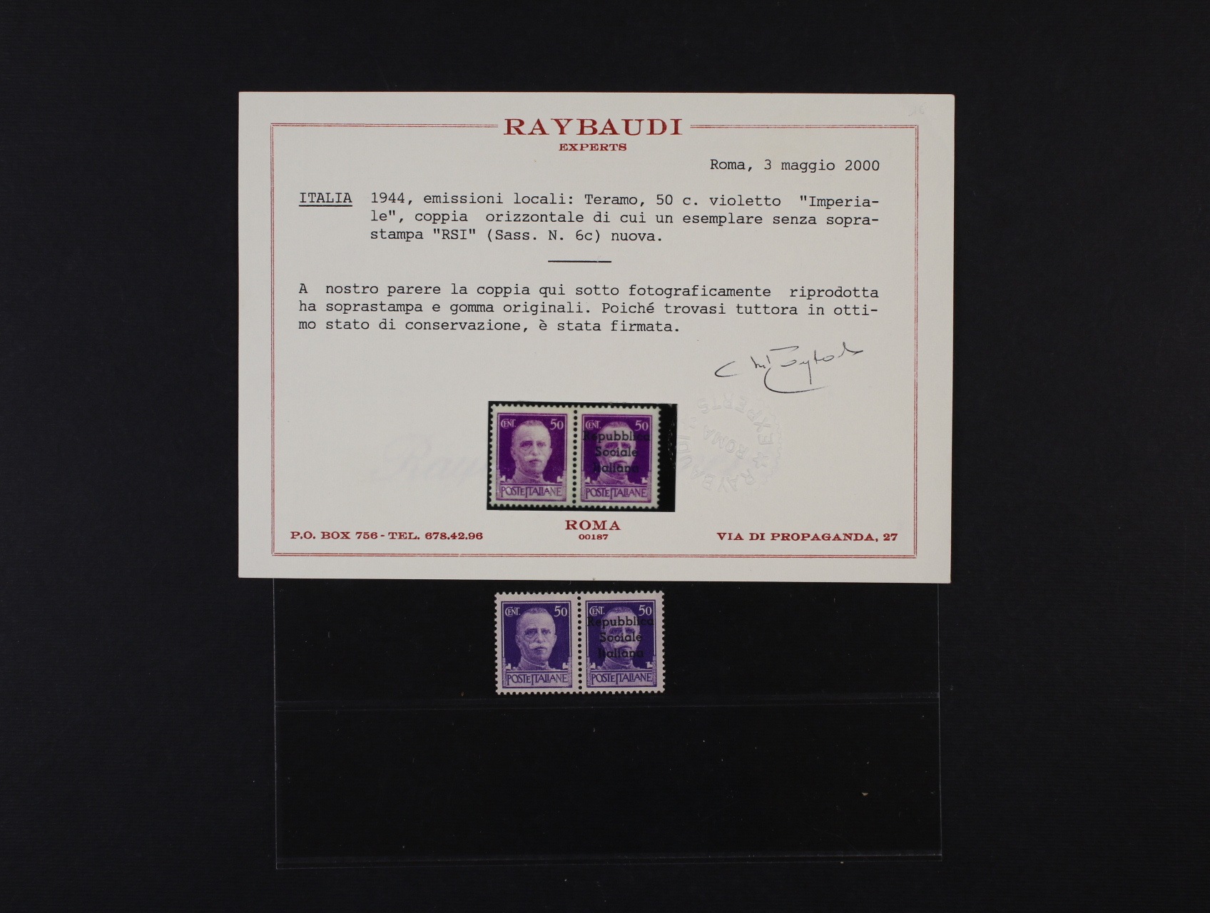 Repubblica Sociale Italiana - zn. Sass. č. 6c ve vodorovné 2-pásce - VLEVO VYNECHANÝ PŘETISK; po nálepce, atest Raybaudi, kat. 4.000 EUR, vzácný chybotisk z velmi oblíbeného válečného období