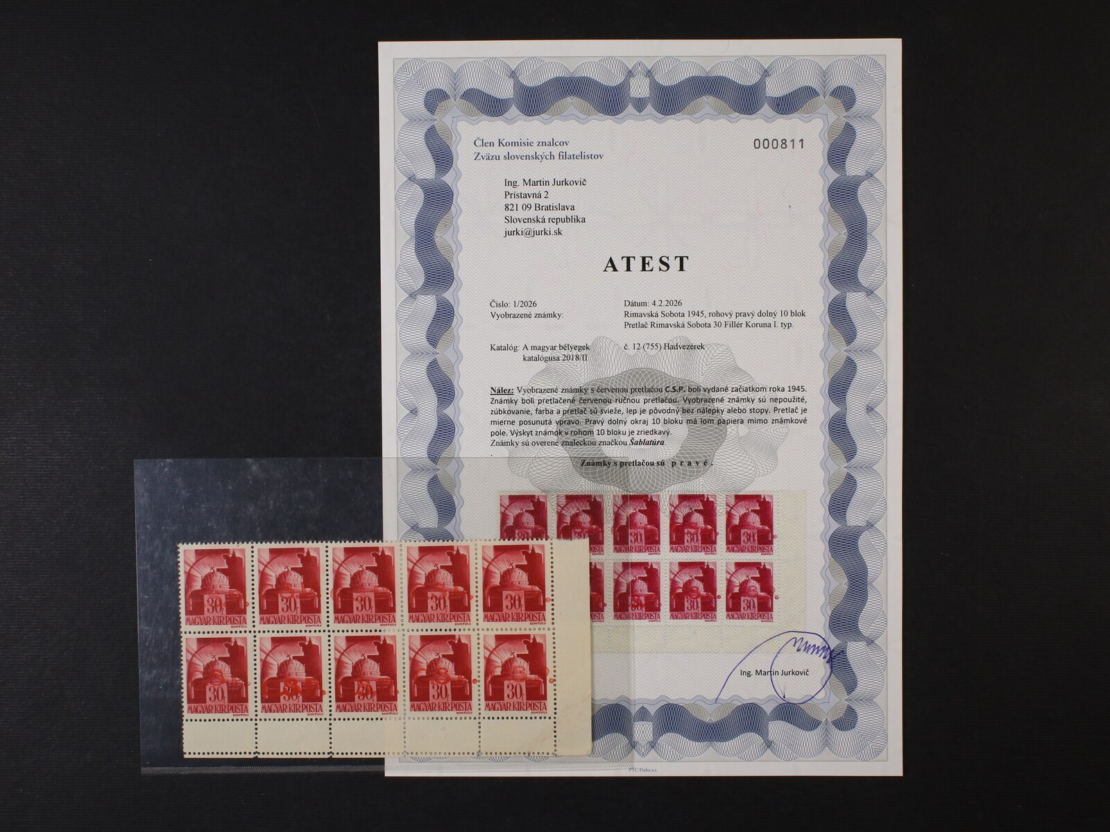 Rimavská Sobota - maď. zn. Mi. č. 736 - pravý spodní roh. 10ti-blok s červeným přetiskem C.S.P. s mírným posunem vpravo až mimo zn., na spodním okraji dvojitá perforace, v pravém dolním rohu mimo zn. lom v papíru, zk. Šablatúra, atest Jurkovič, větší kraj. bloky velmi vzácné