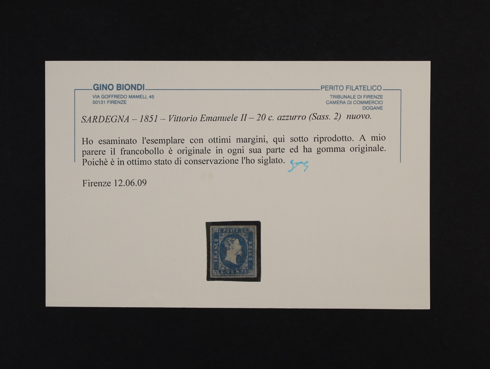 • Sardinie - zn. Sas. č. 2, zk. a atest Biondi, kat. sas. 28000 EUR