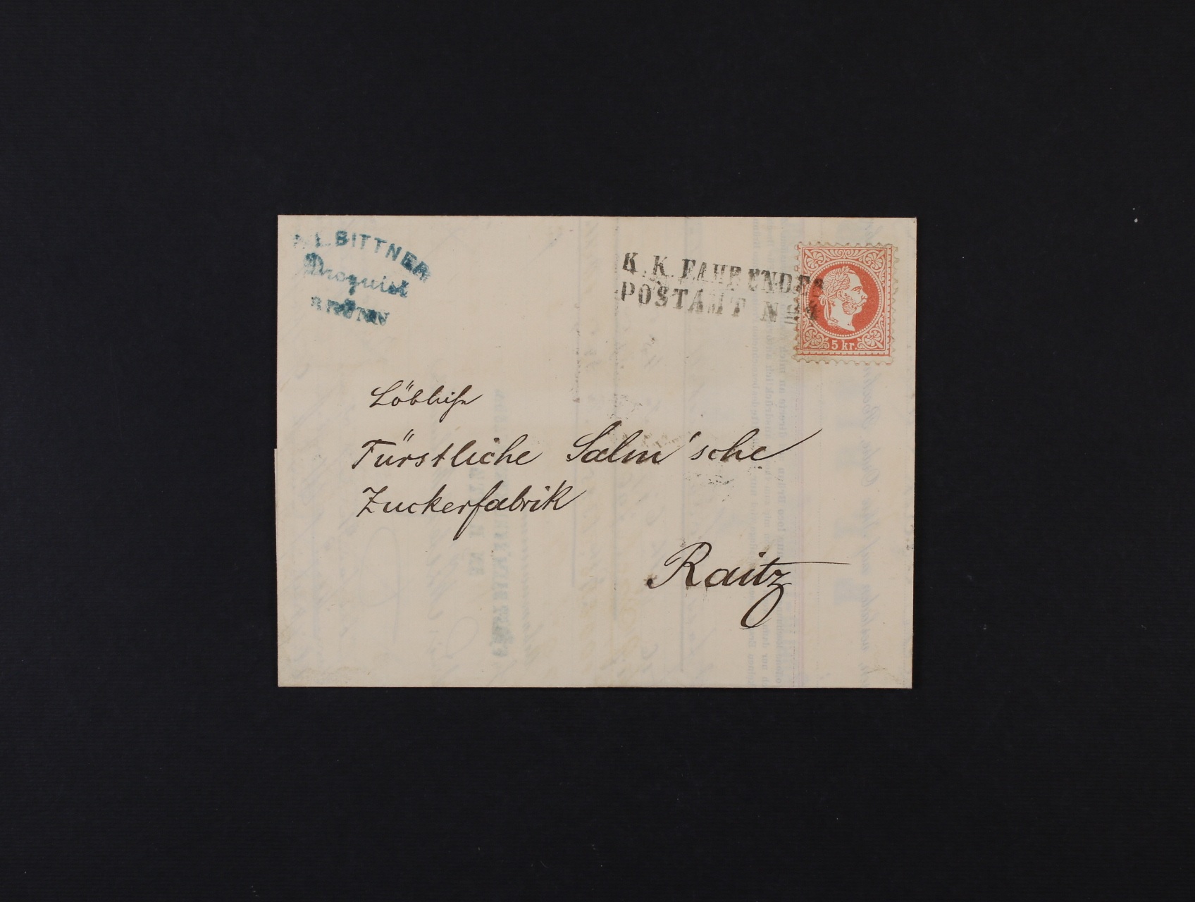 • skl. firemní dopis - faktura z r. 1873 do Rájce, frank. zn. 5kr F.J. I.  hrubý vous, pod dvouřádk. raz. K.K. FAHRENDES POSTAMT No. 4, dobrá kvalita