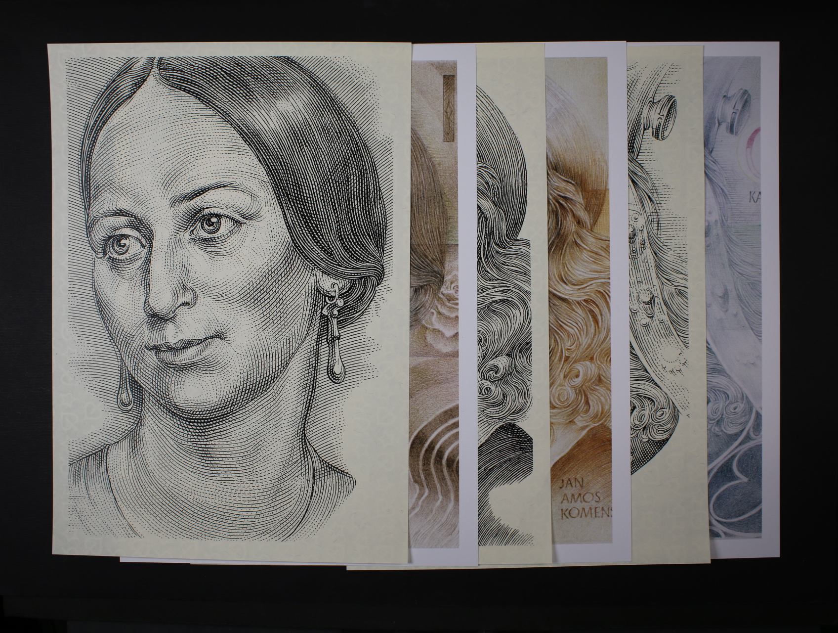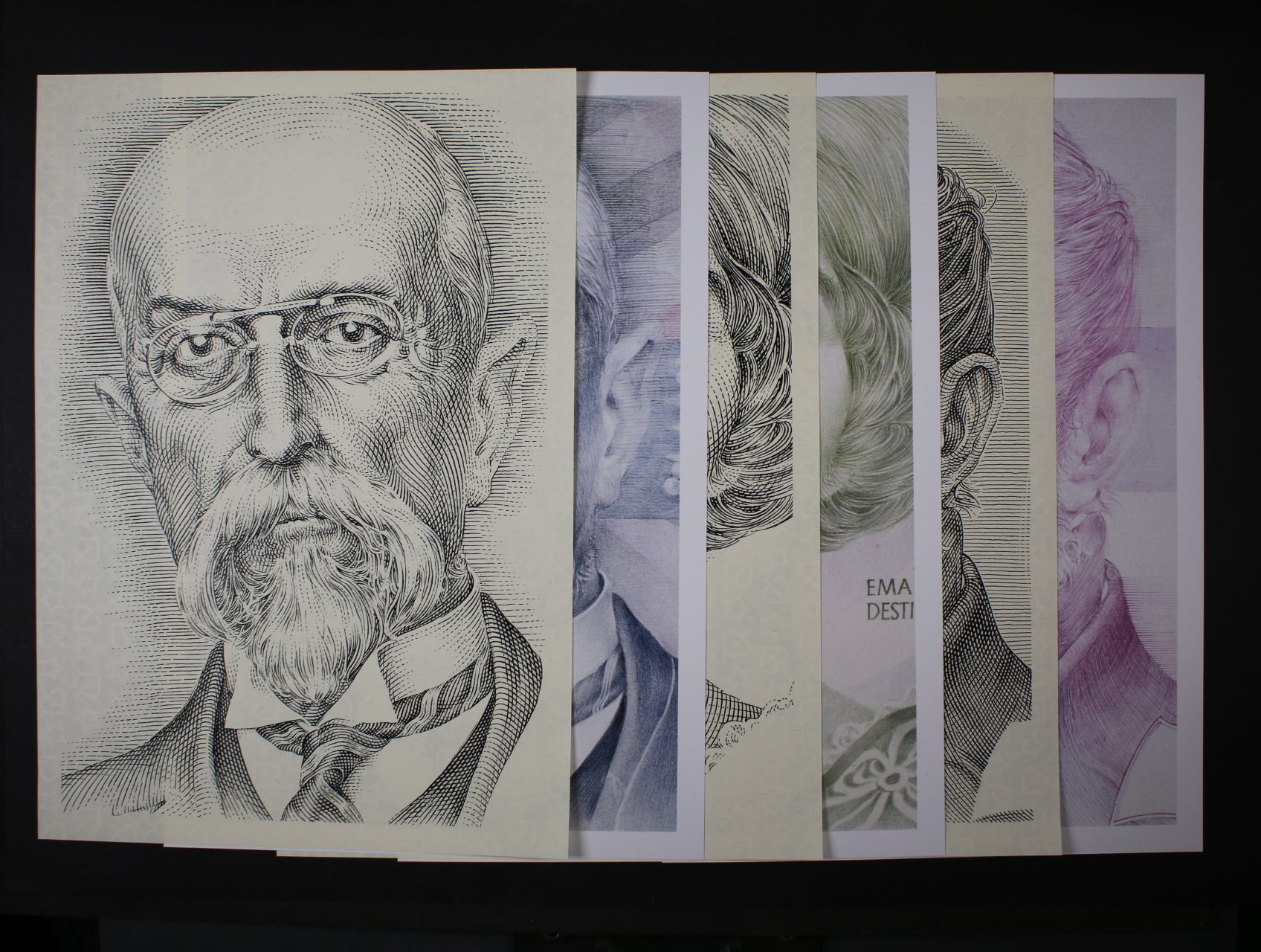 soubor reprodukcí portrétních detailů z bankovek 20, 50, 100, 200, 500, 1000, 2000 a 5000 Kč a liniových rozkrezeb od autora O.Kulhánka k příležitosti jeho narozenin, 8x karton a 8x papír s vodoznakem, formát A4, dárkové balení ČNB