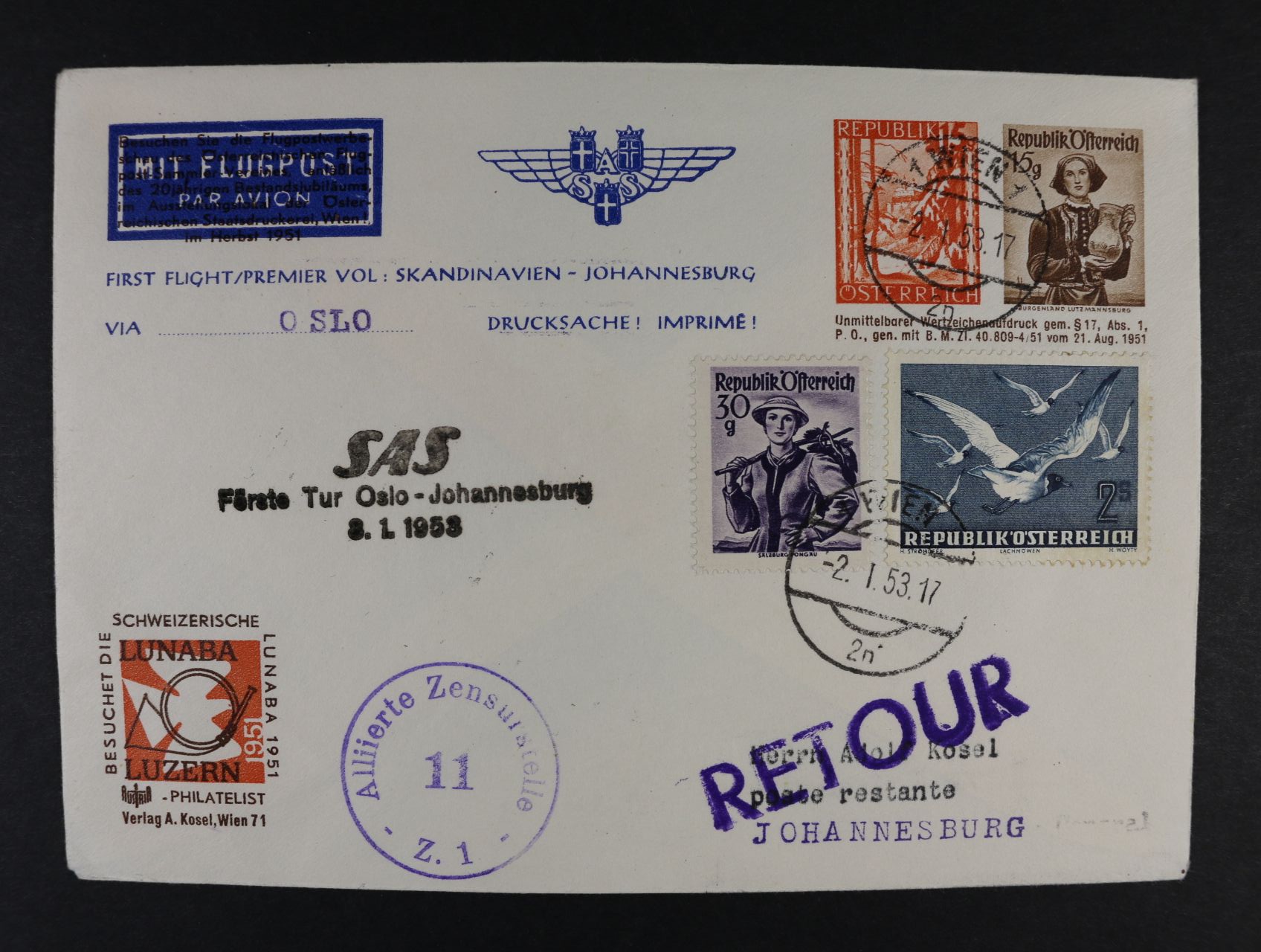 spec. letecká obálka z výstavy LUNABA k 1. letu SAS OSLO - JOHANESBURG 8.1.1953 s přitištěnými zn. Mi. č. 841 + 896, dofrank. zn. Mi. 900, 956, pod. raz. WIEN 2.1.53, cenzurní, průch. a přích. raz.