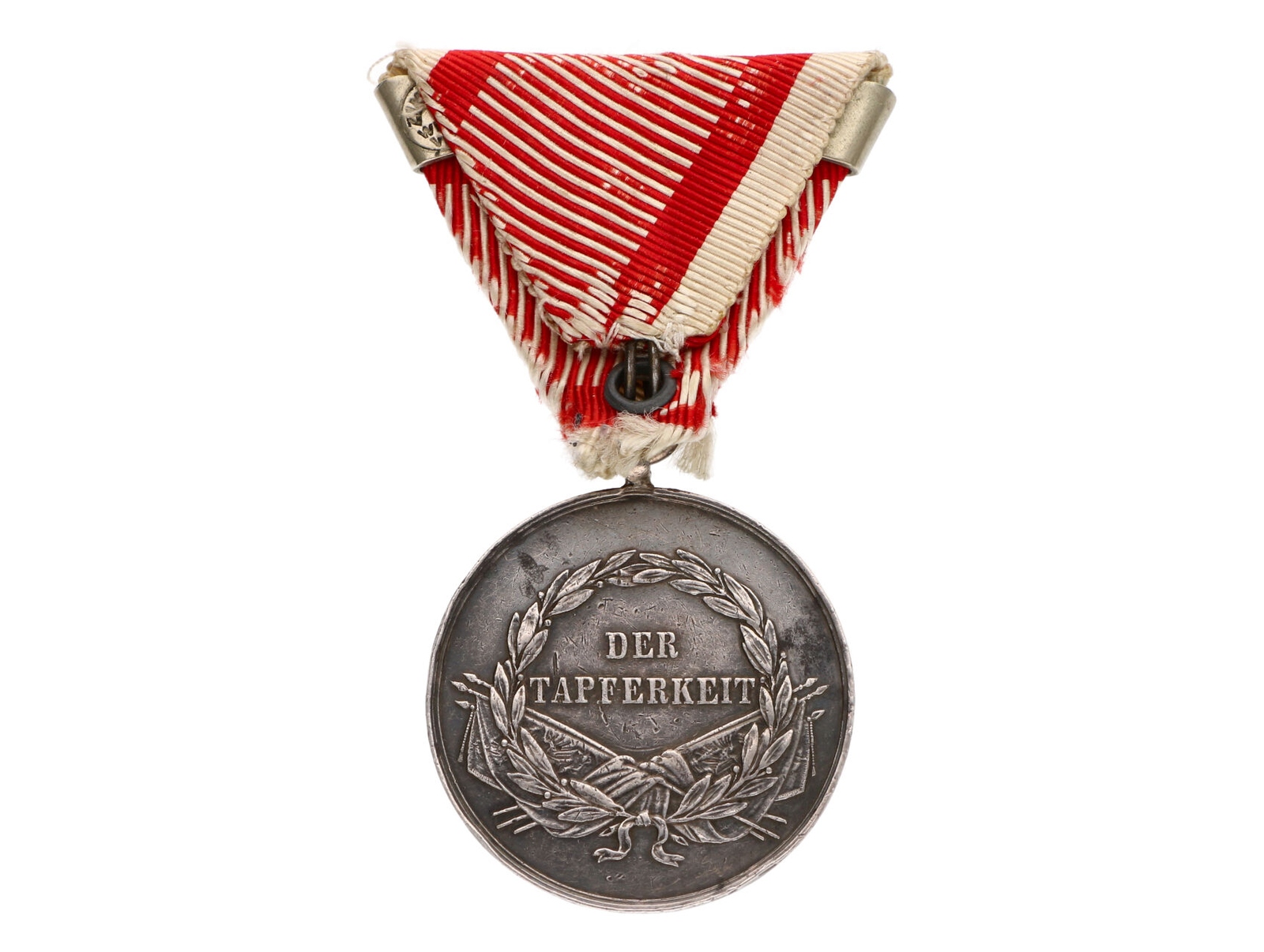 Stříbrná medaile za statečnost 1. třídy, 8. vydání 1914-1917 F.J.I., na hraně punc hl. punc. úřadu Vídeň, A v kroužku, původní trojúhelníková stuha s páskou za druhé udělení, značená ZIMBLER WIEN VII, Marko230a+A11a