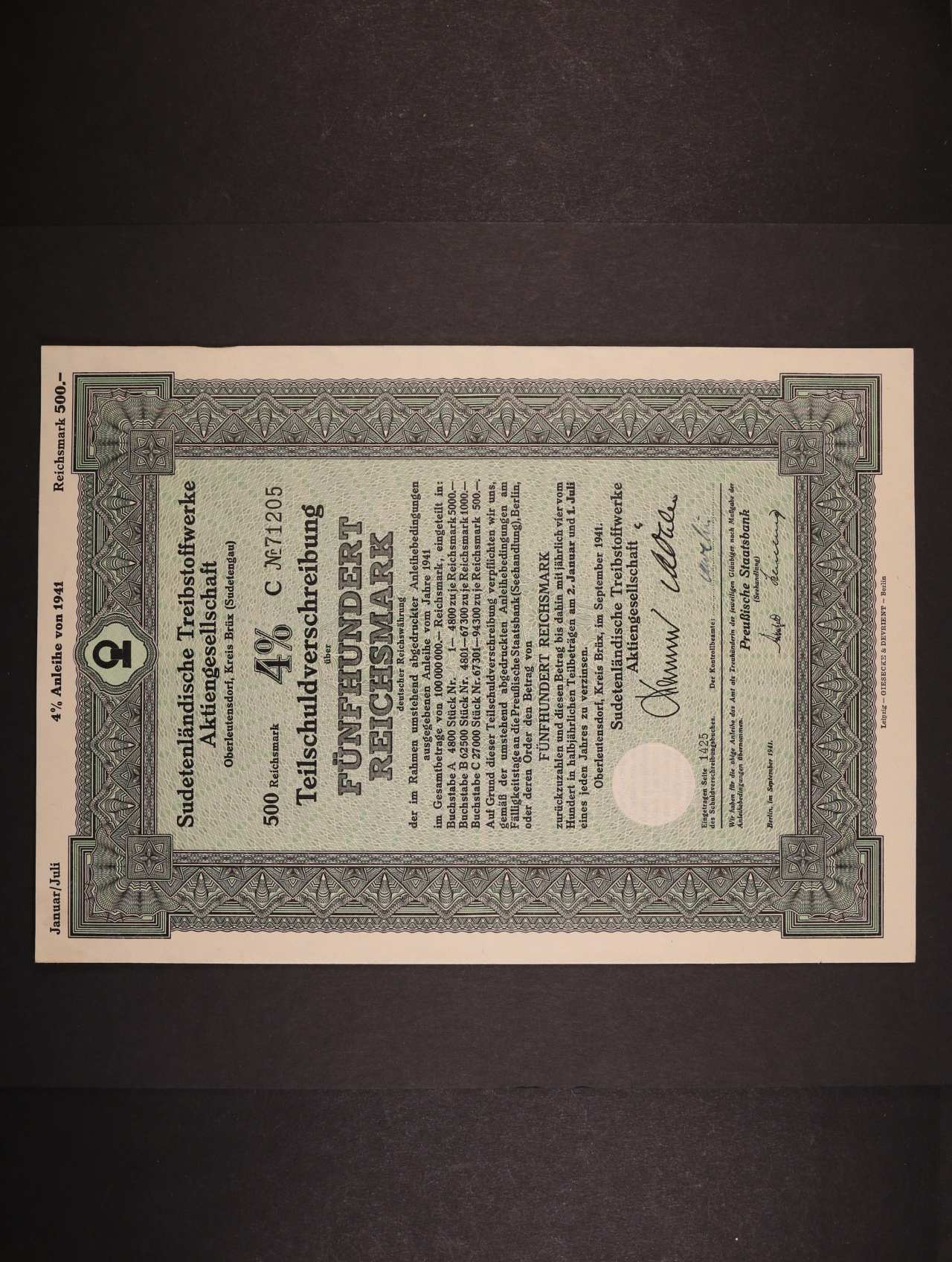 Sudety, Dílčí dlužní úpis na 500 Reichsmark 1941 Sudetenländische Treibstoffwerke Aktiengesellschaft Brüx (Most)
