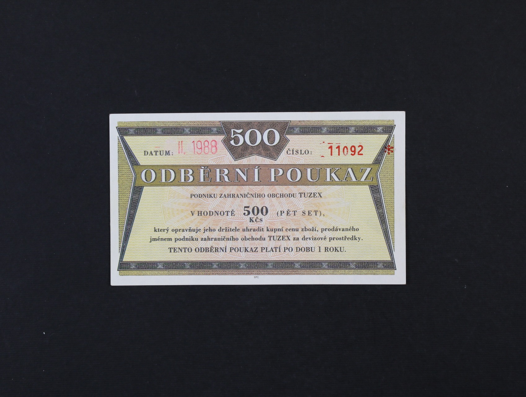 Tuzex, 500 TKčs II.1988, vyjímečně zdařilý dobový padělek tištěný ofsetem, číslování dotištěné paginýrkou, nezachycený a velmi vzácný exemplář ve vyjímečné zachovalosti, K.Š.K. 62/II/2x