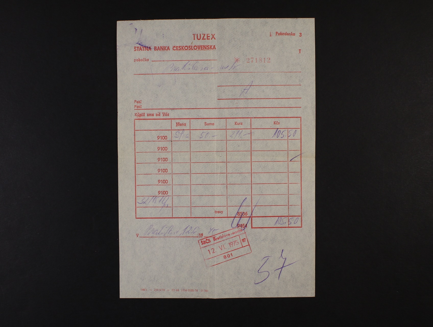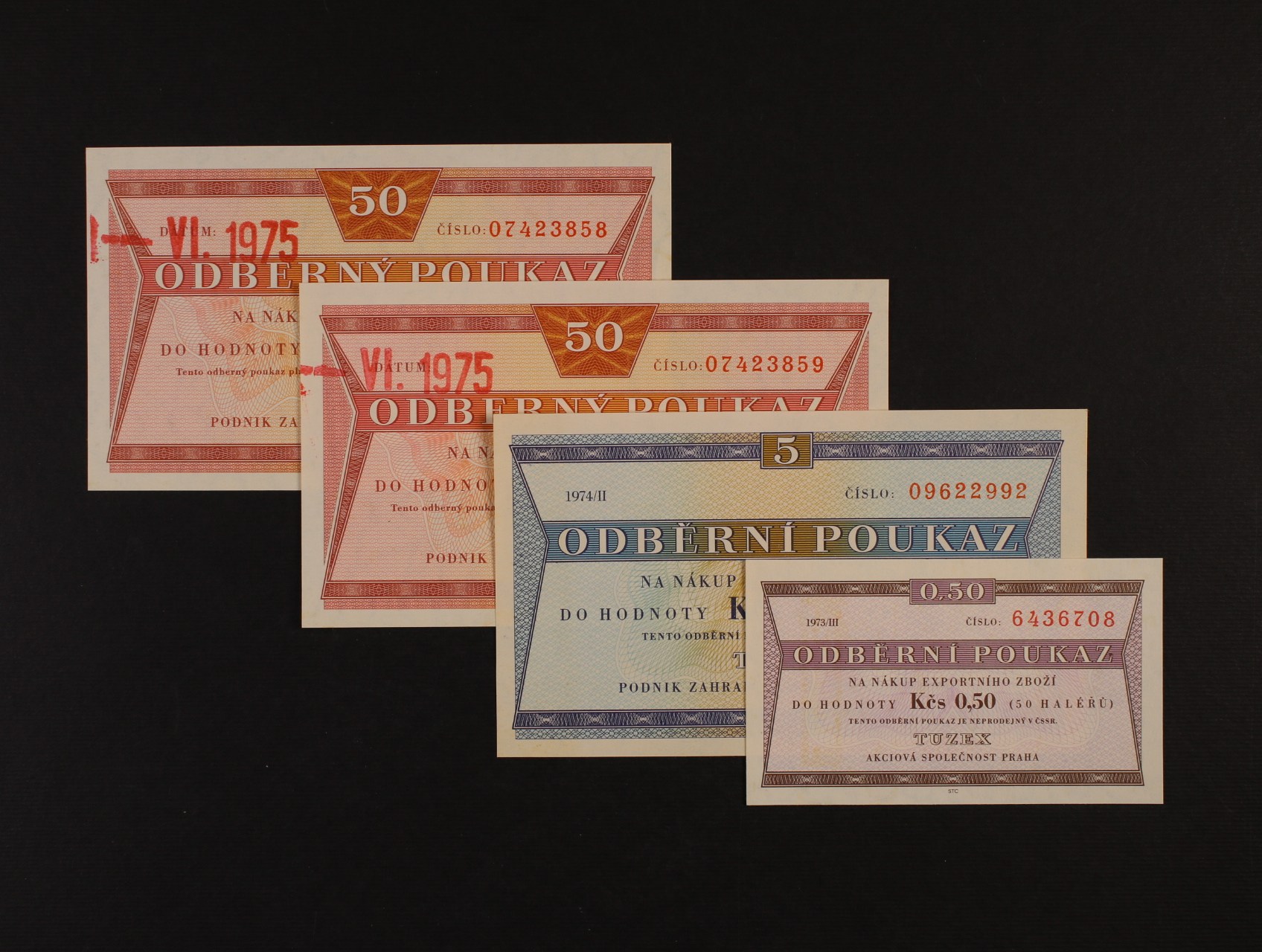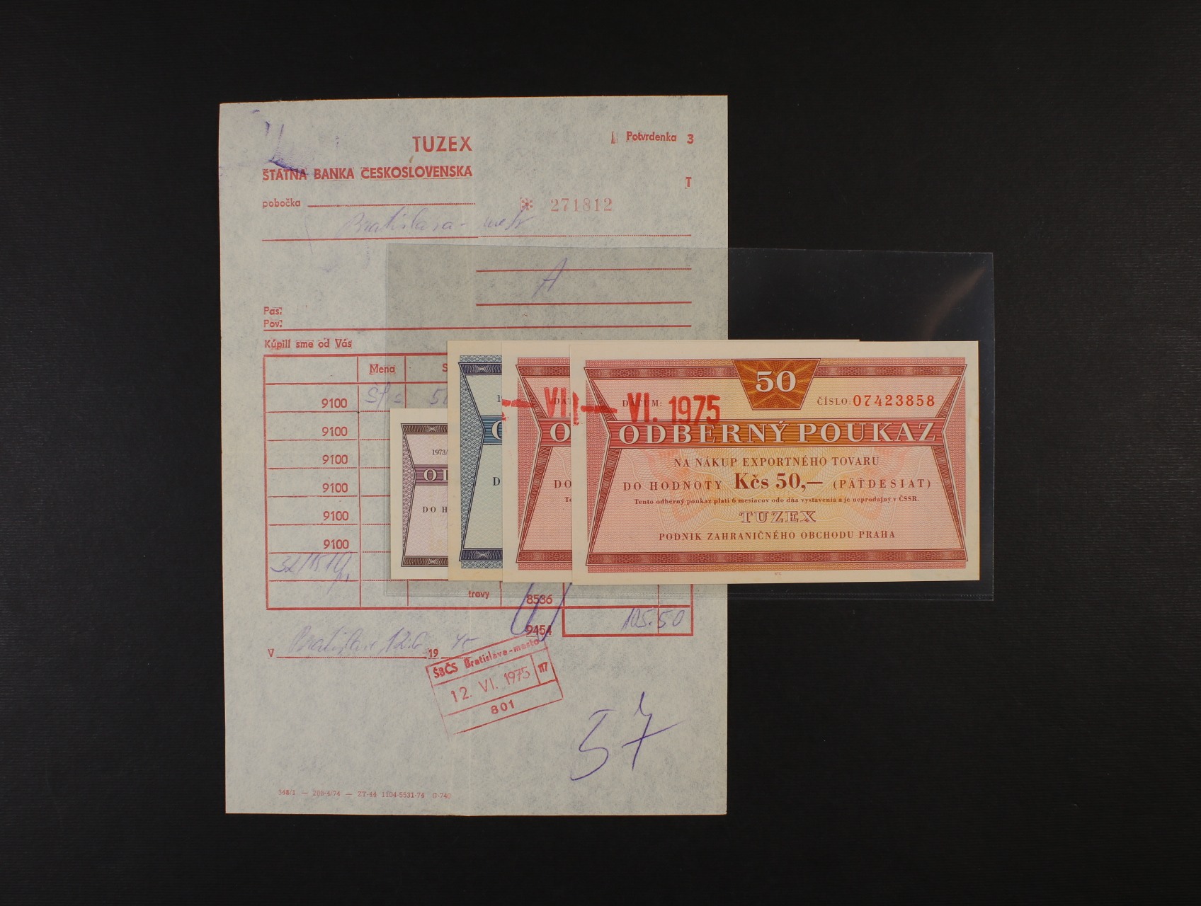• Tuzex, sestav bonů včestně potvrzenky z SBČS Bratislava na 50 Šfrs = 105,50 TKčs z 12.6.1975, 2x 50 TKčs s raz. VI.1975, 5 TKčs 1974/II a 0,50 TKčs 1973/III, K.Š.K. 47/VII/a, 49/VII/a, 52/VII/a, velmi zajímavé, 4 kusy + potvrzenka