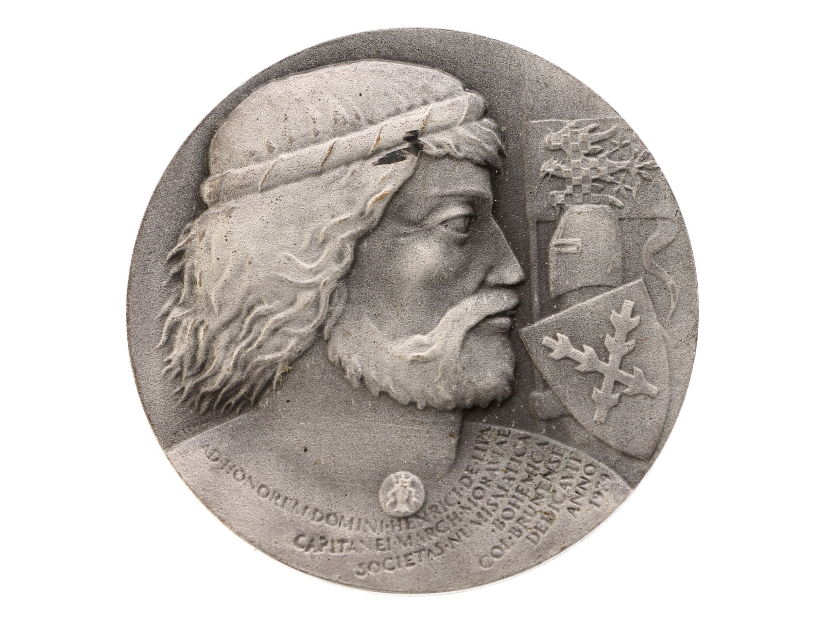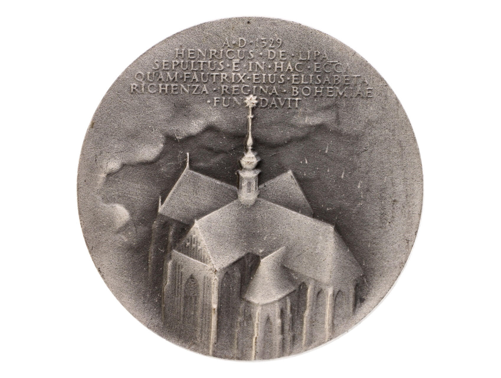 Zeman Karel 1949 - AE Medaile 1981, 650. výročí úmrtí Jindřicha z Lipé. Portrét zprava, vpravo zbrojnoš, text / pohled na starobrněnský chrám z ptačí perspektivy, text. Postříbřený tombak 40 mm, raženo 300 kusů, KZ26
