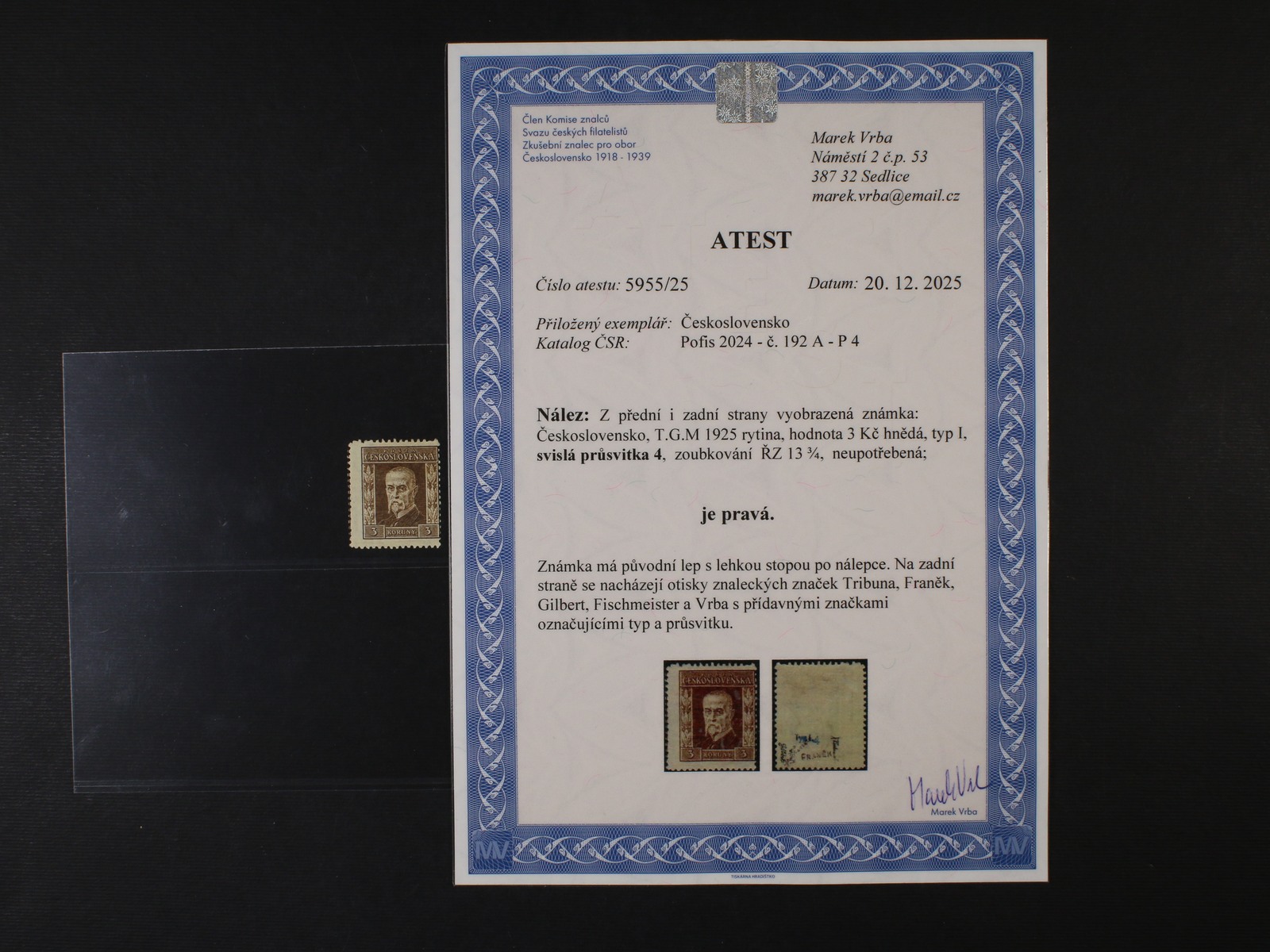 • zn. č. 192 A, typ I, pr. P4, původní lep s lehkou stopu po nál., zk. Tribuna, Franěk, Gilbert. Fischmeister, Vrba, atest vrba, zajímavé, vzácné