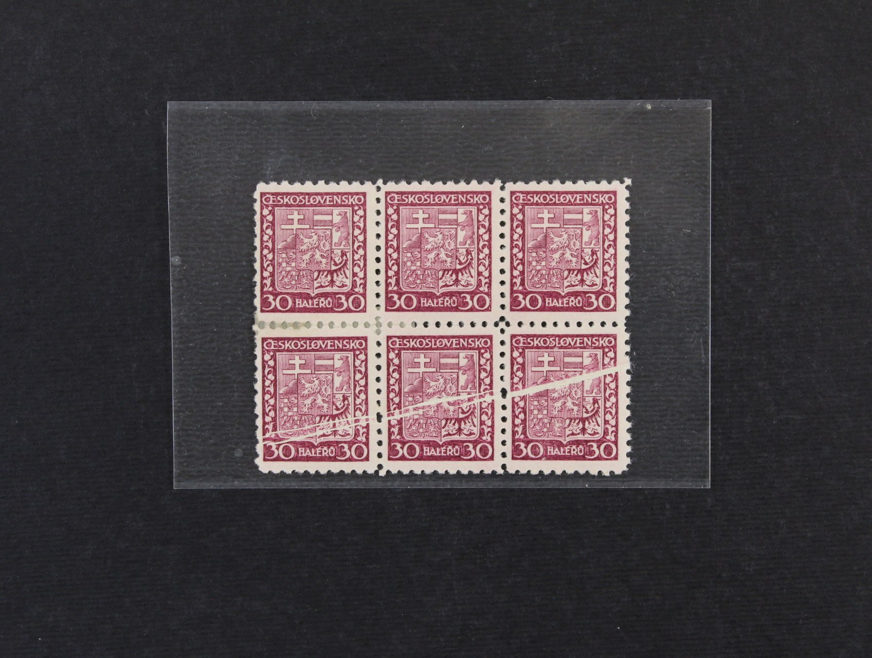 zn. č. 252 v 6ti-bloku s příčnou složkou papíru na spodní třípásce, zk. Gilbert
