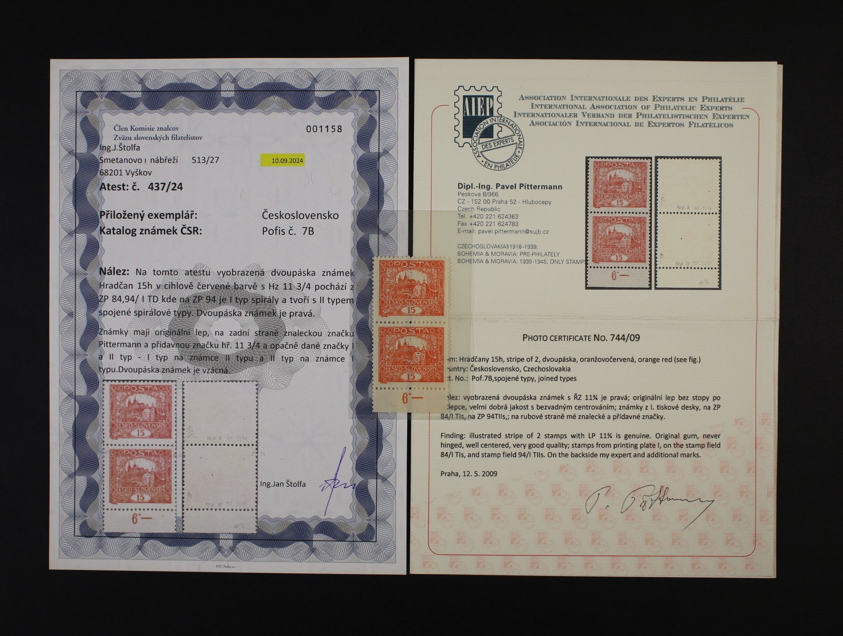 zn. č. 7 B ST ve svislé dvoupásce se spodním okrajem a počitadlem 6,-, TD 1, ZP 84 typ II, ZP 94, typ I, velmi dobrá kvalita, zk. Pittermann, atest Štolfa,vzácné, kat. cena 70000 Kč