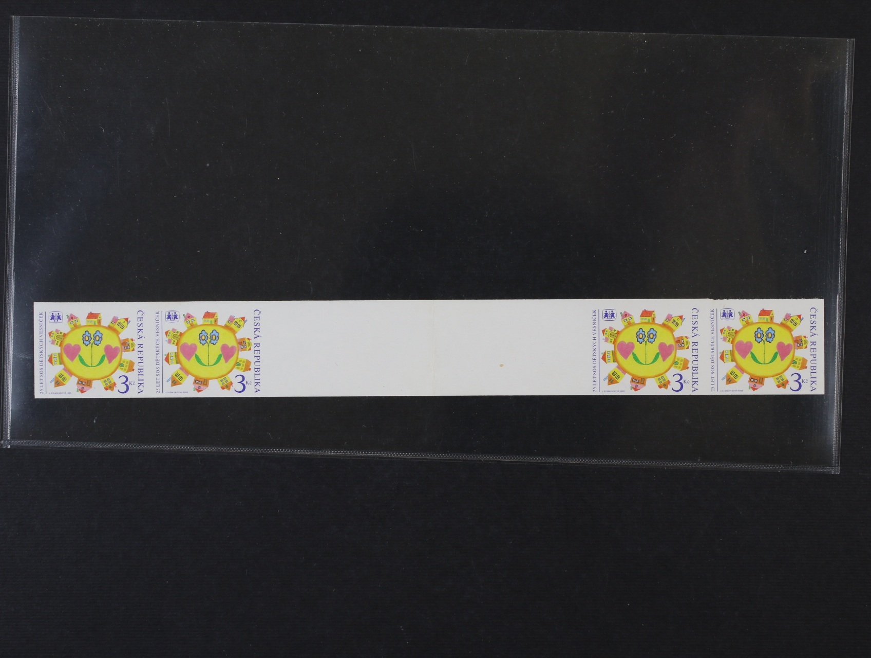 zn. č. 88 "25 let SOS dětských vesniček" v nominál. hodnotě 3 Kč - stříhané čtyřzn. meziarší vodorovné, uprostřed svisle přeložené, zatím známo jen 10 ks, atest Arbeit