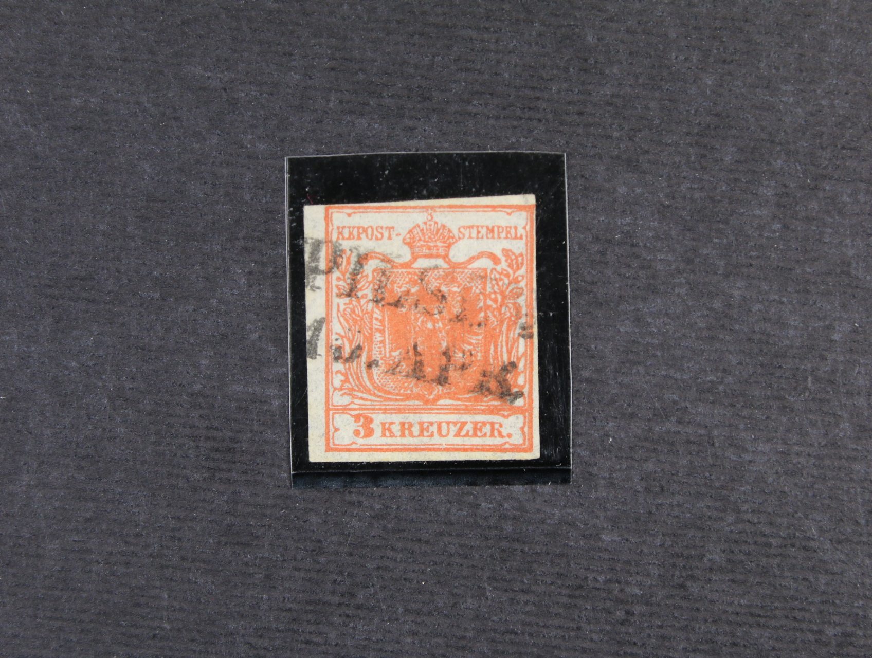 • zn. Fe. č. 3 H, typ Ia, rumělková se stroj. obtiskem, na části (uprostřed) zn. ryhovaný papír, téměř kompl. řádk. raz. PILSEN 13.APR., zk. a atest Ferchenbauer s označením RR, velmi zajímavé, vzácné