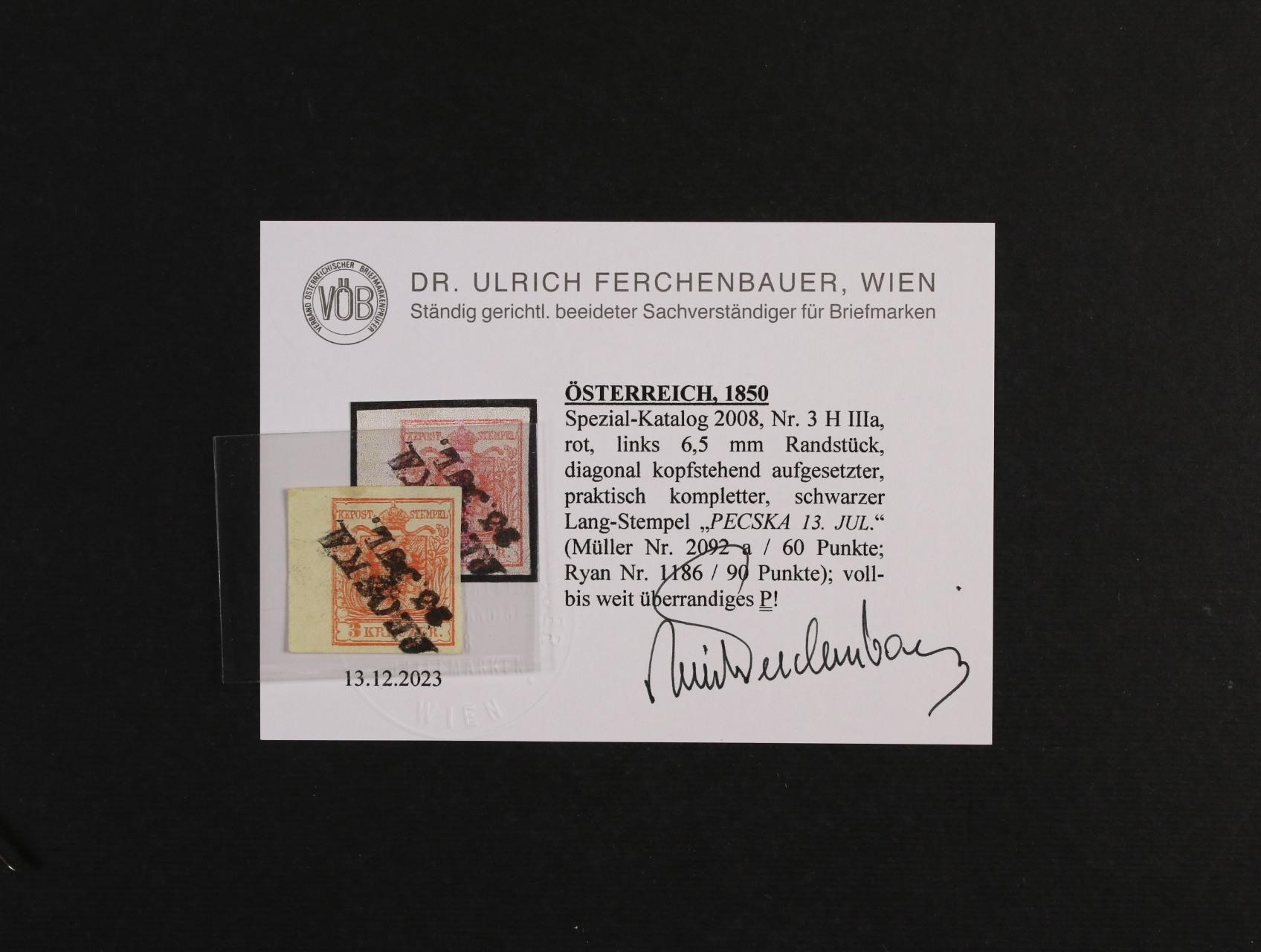 • zn. Fe. č. 3 HP, typ IIIa s levým okrajem 6,5 mm a řádkovým kompl. raz. PECKA 13.JUL., lux. střih, zk. a atest Ferchenbauer