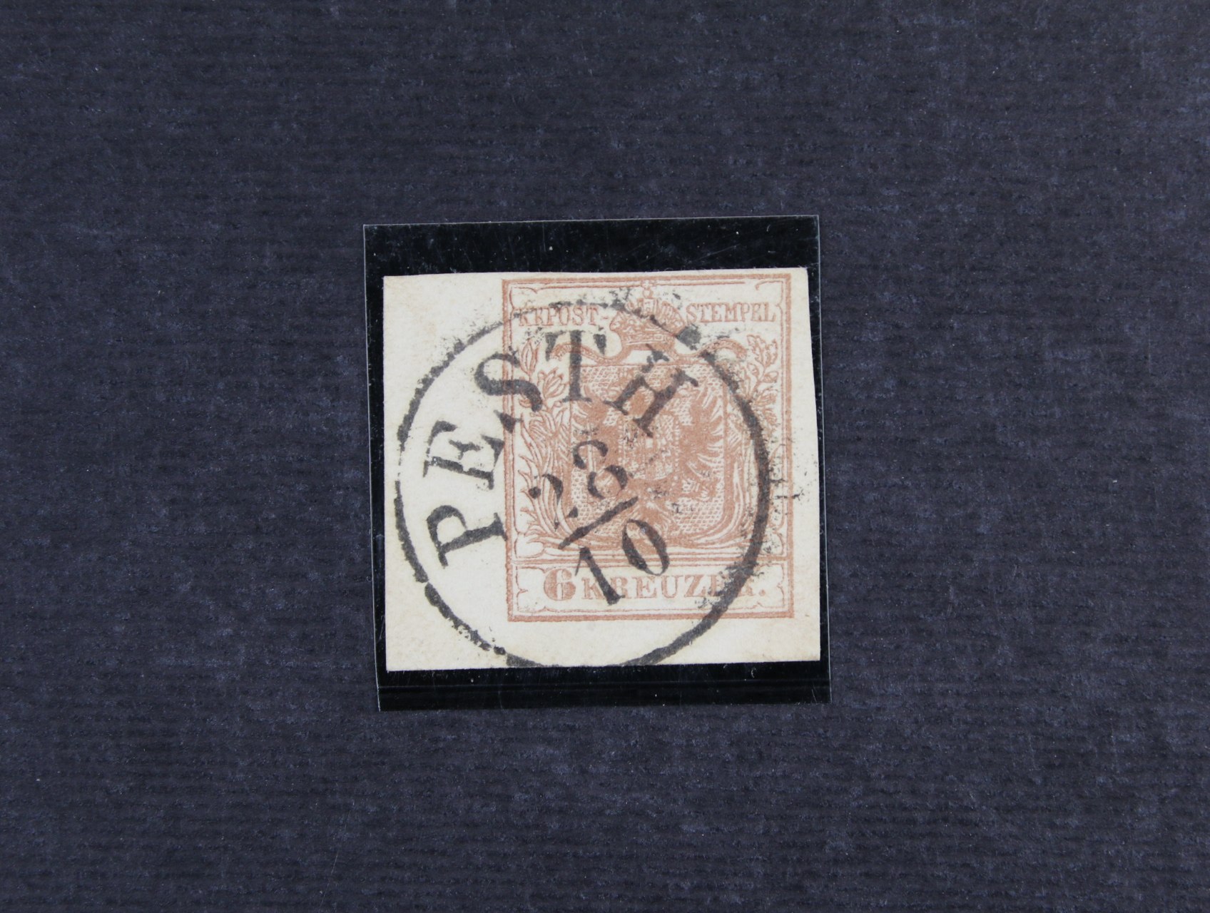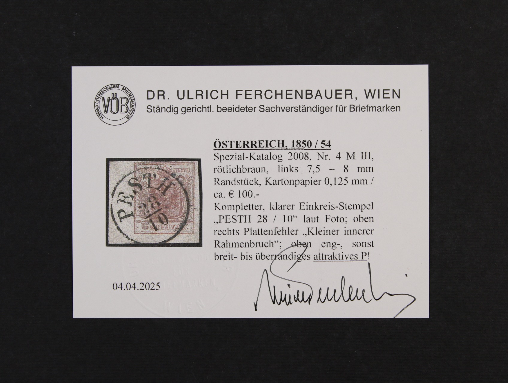 zn. Fe. č. 4 M, typ III červenohnědá s levým okrajem 7,5 - 8 mm, karton. papír 0,125 mm, jednokruh. raz. PESTH 28.10., zk. a atest Ferchenbauer, 100 EUR