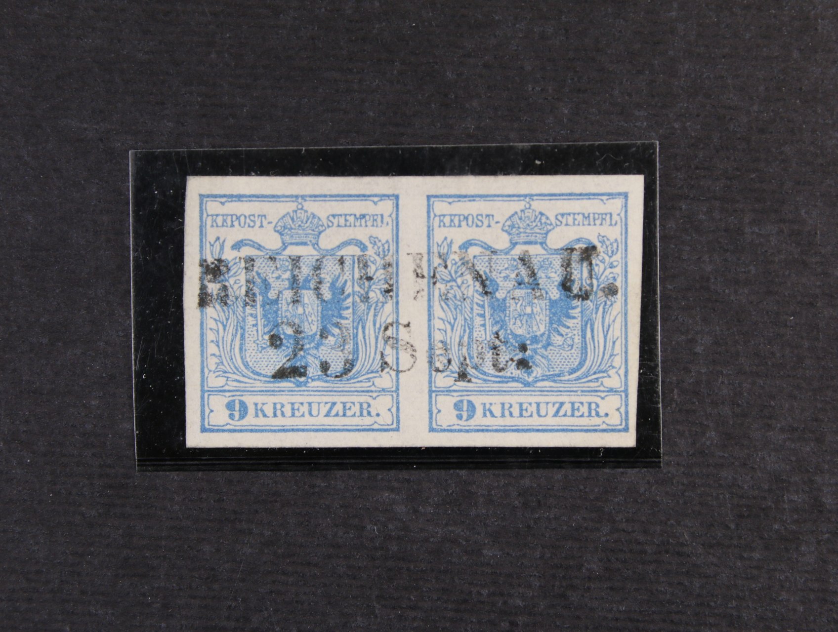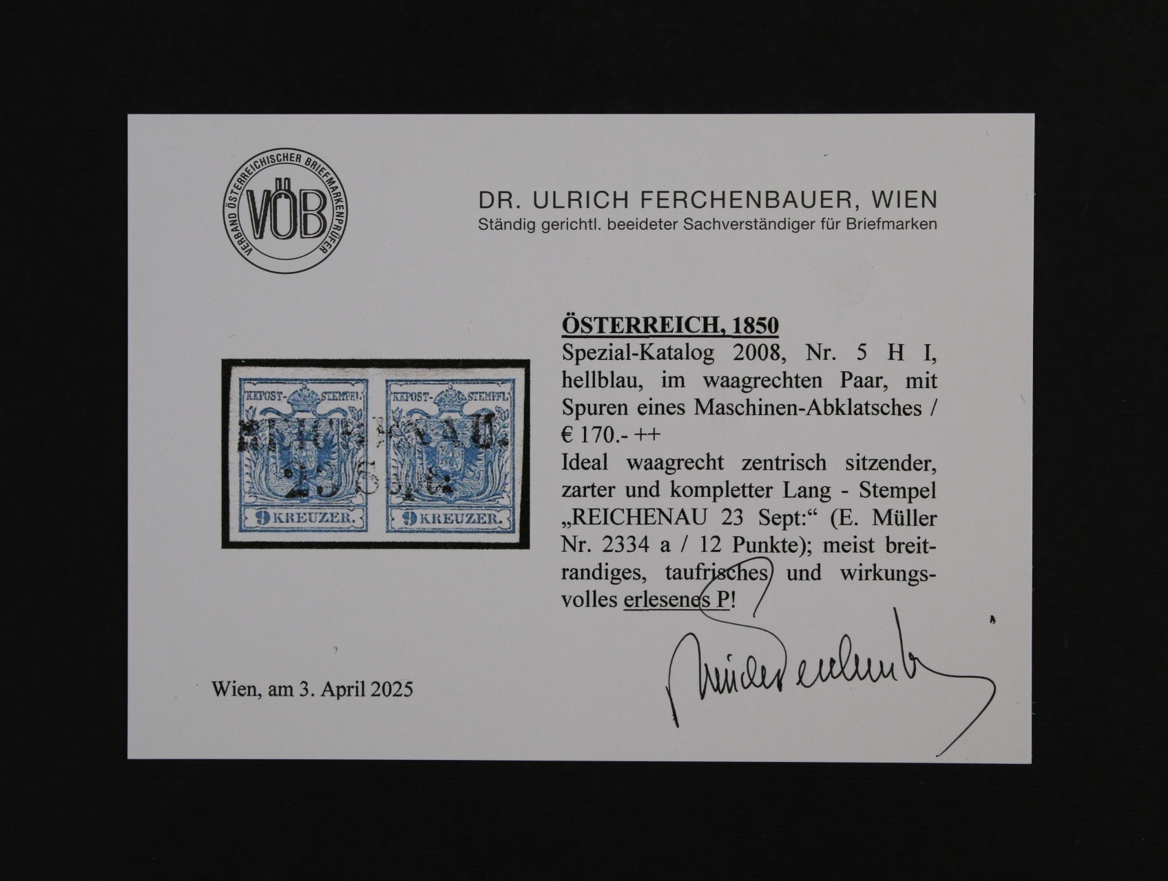 • zn. Fe. č. 5 H, typ I světlemodrá ve vodorovné dvoupásce s černým řádk. raz. REICHENAU 23.SEPT., zk. a atest Ferchenbauer, kat. cena 170 EUR ++