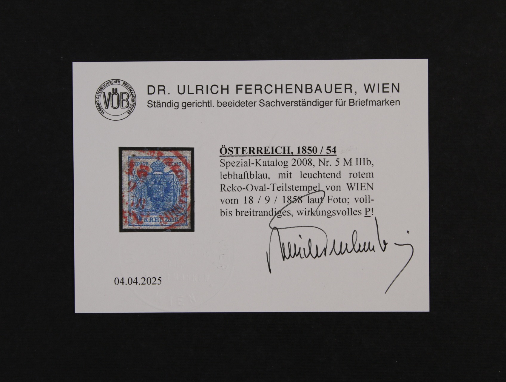 • zn. Fe. č. 5 M, typ IIIb jasně modrá s nekpmpl. oválným raz. RECO WIEN 18.9.1858, zk. a atest Ferchenbauer