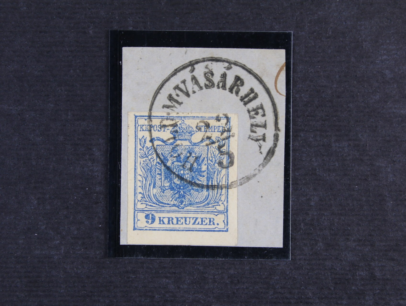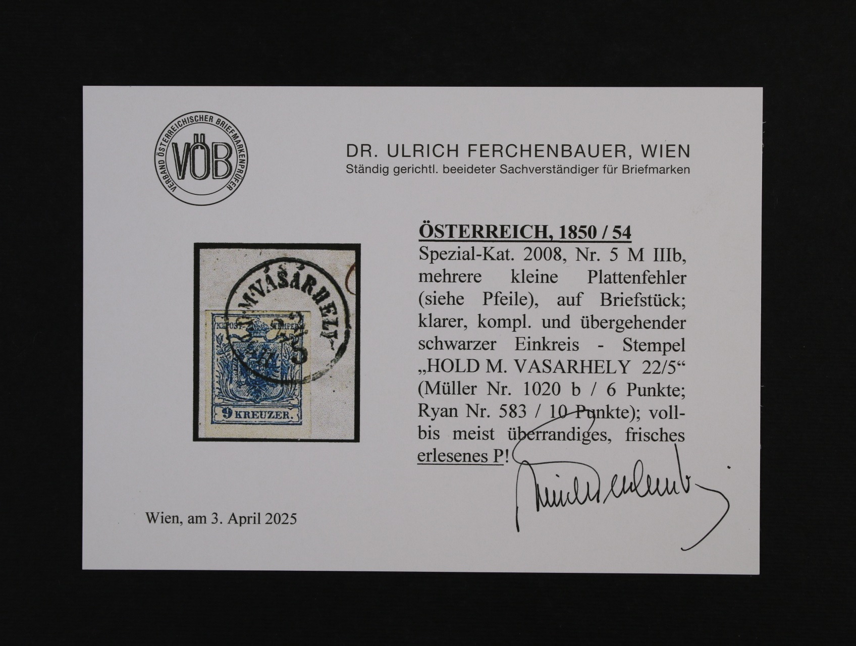 • zn. Fe. č. 5 M, typ IIIb s DV několik bílých skvrn v obrazu zn. na výstřižku s kompl. jednokruh. raz. HOLD EM. VASARHELY 22.5., zk. a atst Ferchenbauer