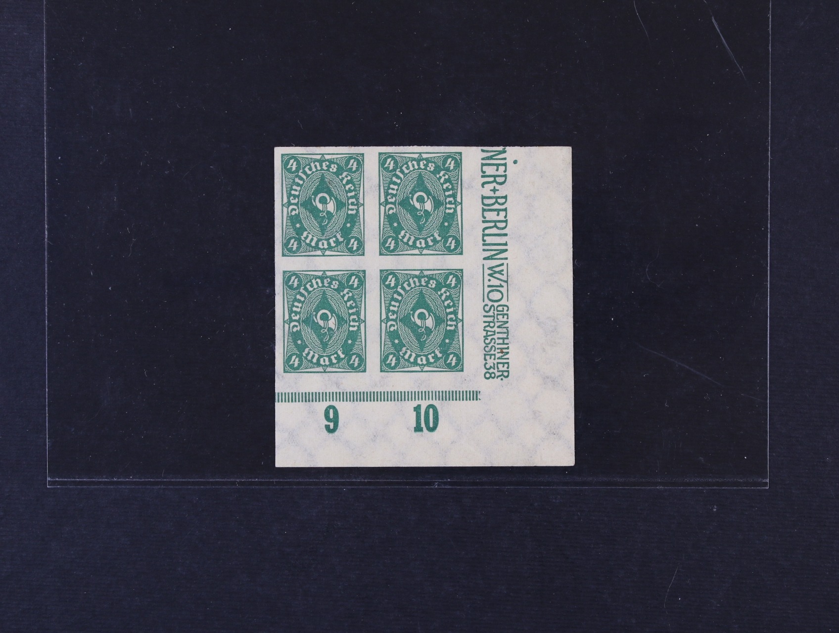 zn. Mi. č. 226aU - pravý spodní rohový 4-blok Znak 4M zelená, NEZOUBKOVANÝ, dole s počitadly; lux. kvalita, kat. min. 680 EUR