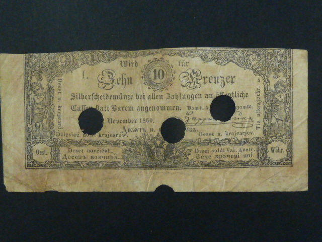 10 Kr 1.11.1860 série I, 3x skartační otvor, Ri. 134