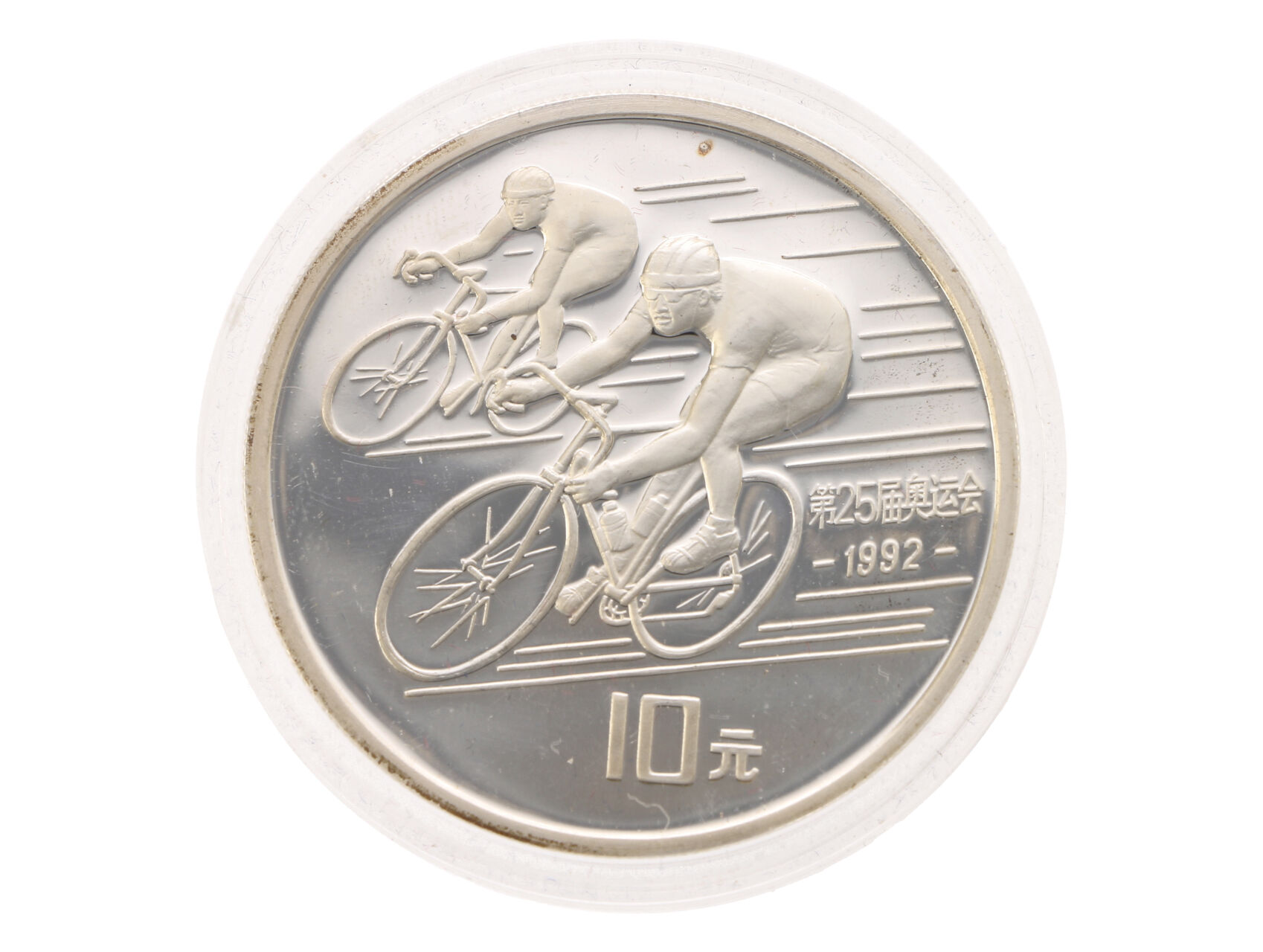 10 Yuan 1990 - Letní olympijské hry 1992, Barcelona - Cyklistika, 30g, 0.900 Ag_