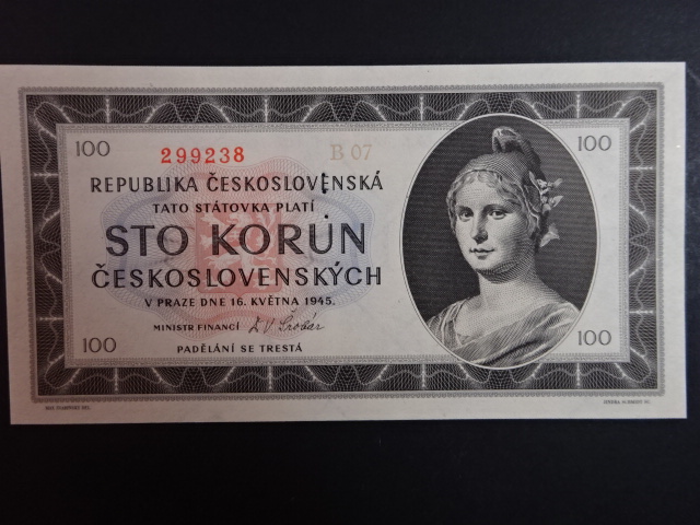 100 Kčs 1945 série B 07, perf. "3md" nad sebou