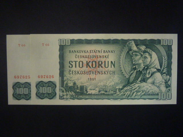 100 Kčs 1961 série T 66, dva kusy s čísly po sobě