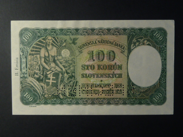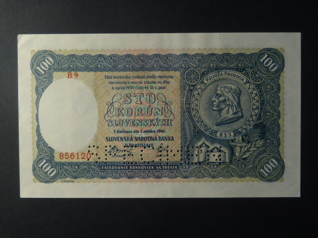 100 Ks 1940 II.vydání, série B 9, 1x perf. SPECIMEN dole