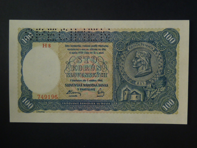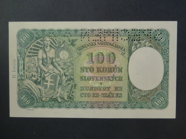 100 Ks 1940 II.vydání, série H 8, 1x perf. SPECIMEN nahoře