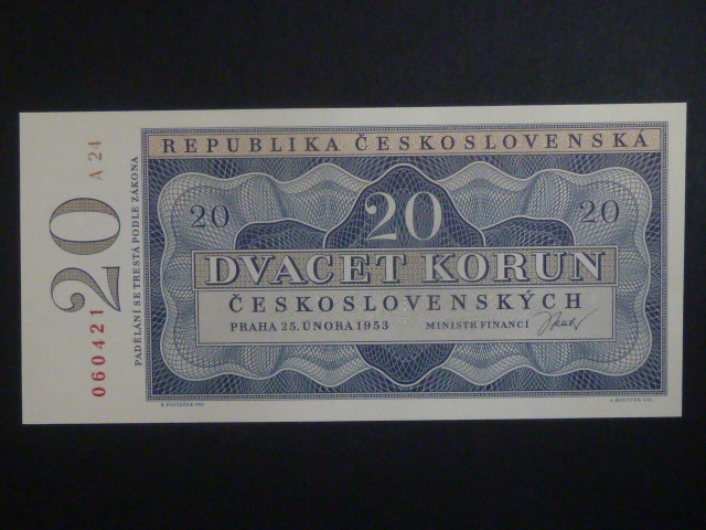 20 Kčs 1953 série A 24, nevydaná, původní exemplář, bezvadná kvalita