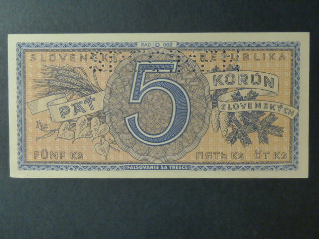 5 Ks 1945 série D 002, perf. SPECIMEN nahoře