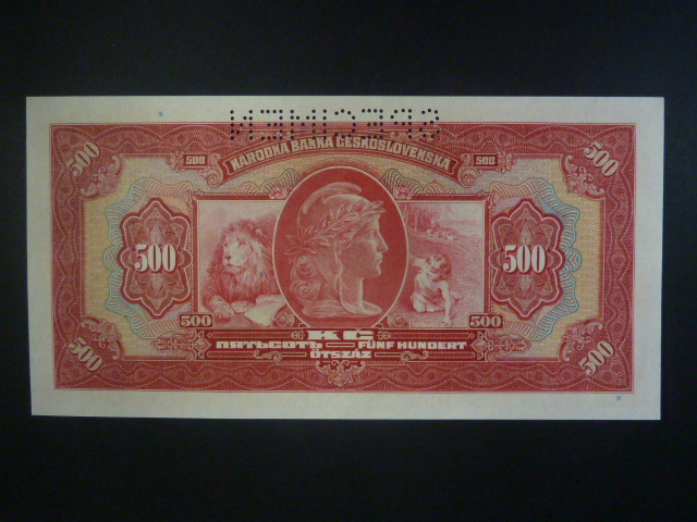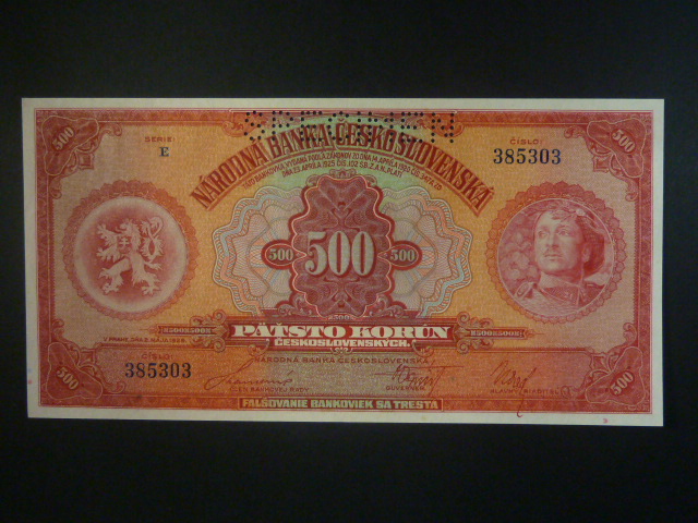 500 Kč 1929 série E, 1x perf. SPECIMEN