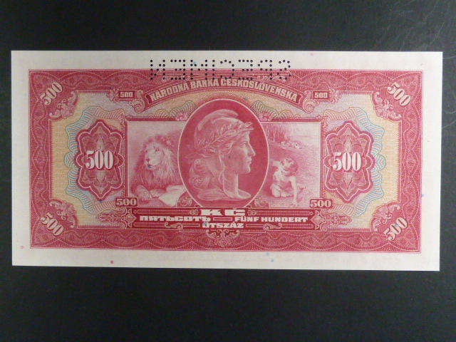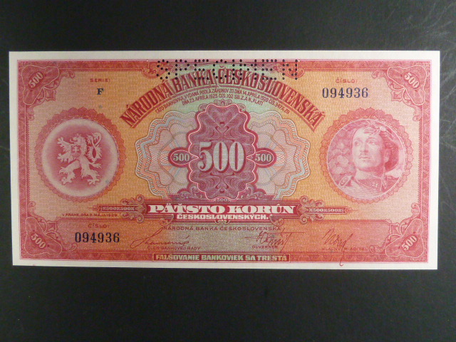 500 Kč 1929 série F, 1x perf. SPECIMEN