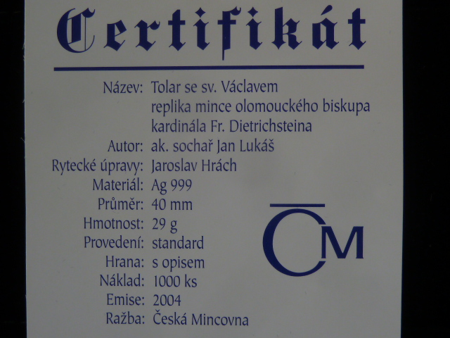 Ag medaile - Tolar sv. Václav 2004, 1 oz, Ag 999, etue + certifikát